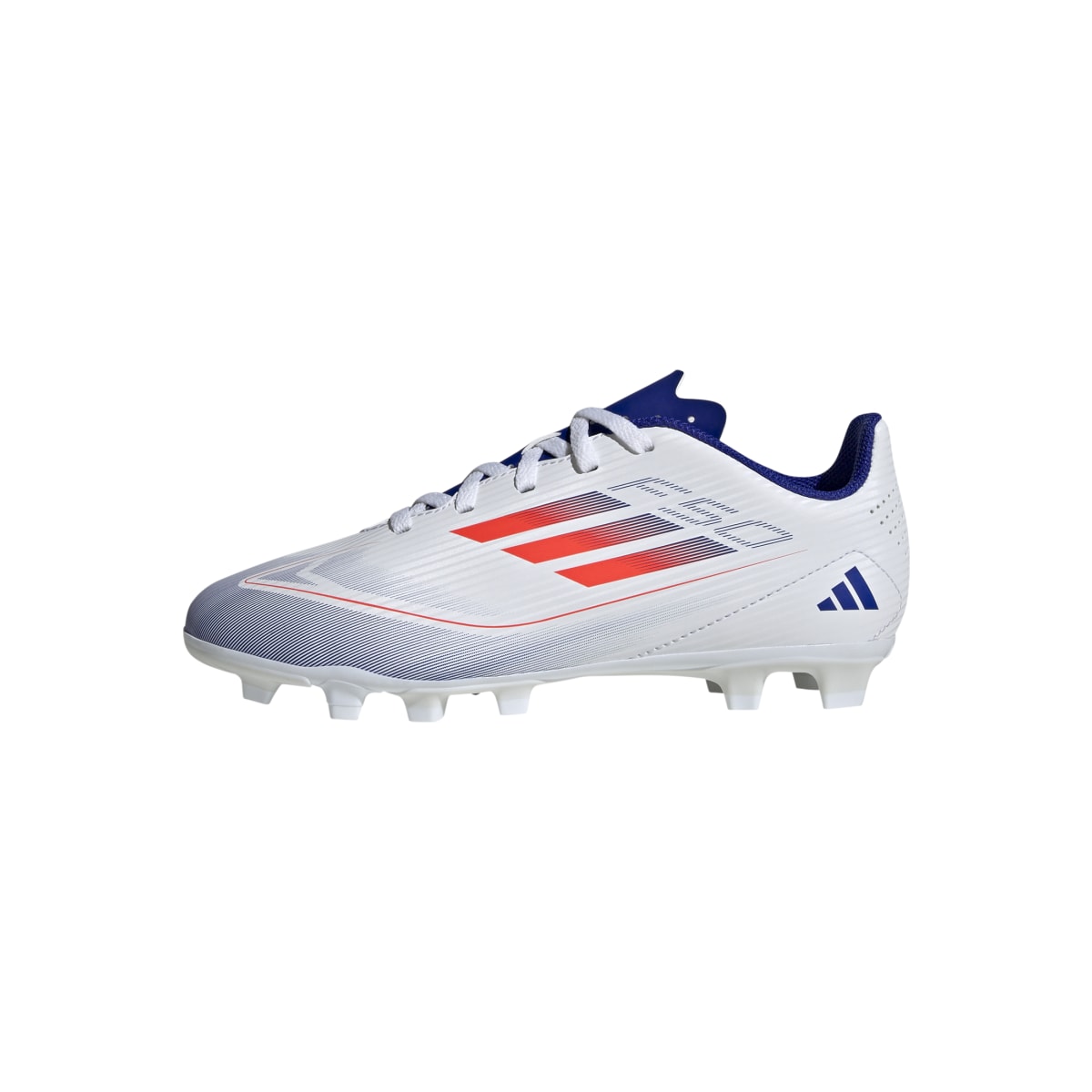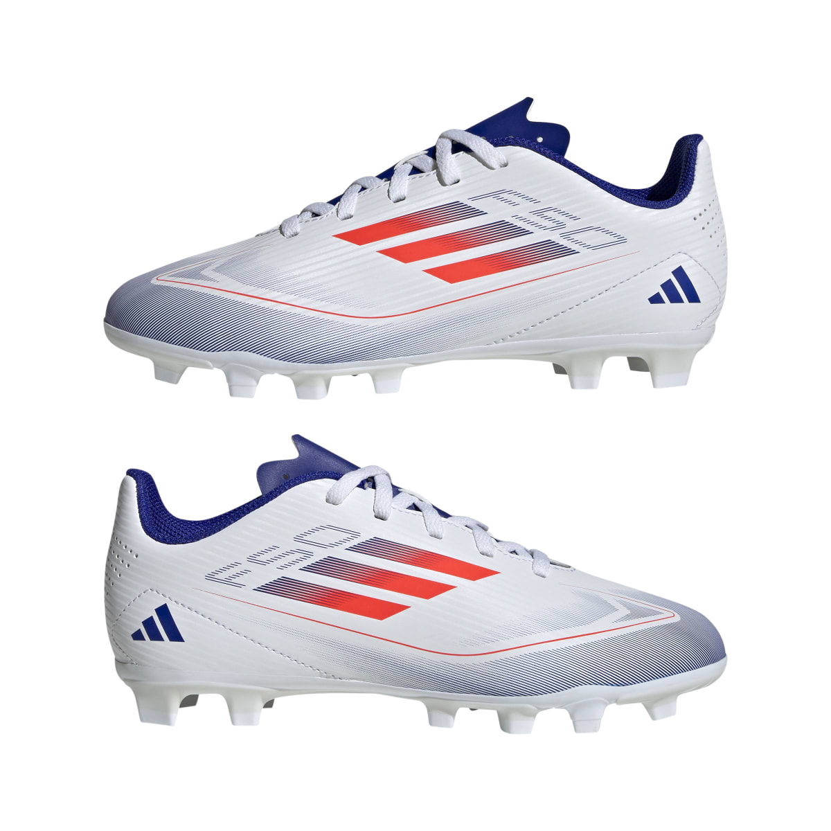 Built for young players who want speed on match day, these adidas F50 Club boots keep the game feeling quick and controlled. A lightweight synthetic upper delivers a comfortable fit for training sessions and weekend fixtures alike. Underfoot, a flexible ground outsole is designed to handle a variety of natural surfaces. Finished in a clean white look with bold blue and red accents for standout style.