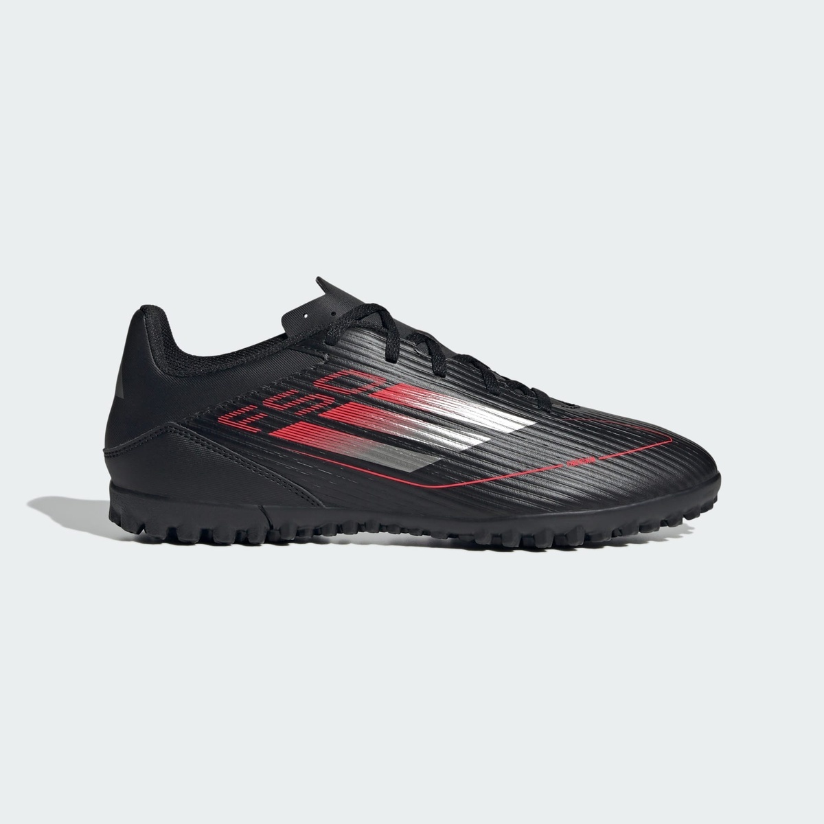 The adidas F50 Club Turf Boots carry the legacy of the iconic F50 speed silo onto artificial turf pitches, combining a sleek low-profile silhouette with a bold Core Black, Iron Metallic, and Lucid Red