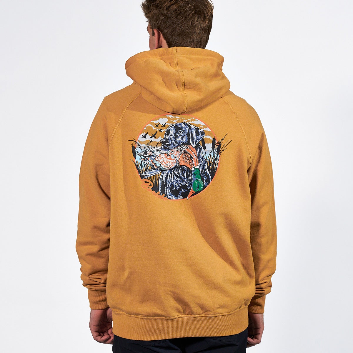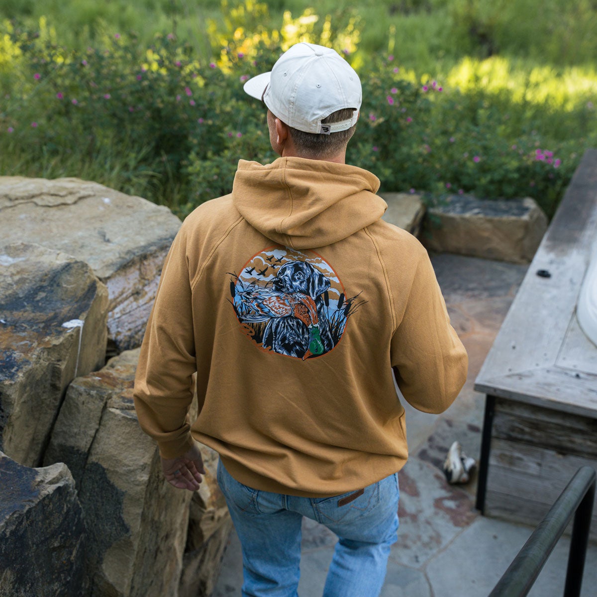The Duck and Dog Fleece Hoodie brings comfort and tradition together in a versatile design. Featuring a rich light brown color and a classic duck-and-dog graphic, this hoodie is perfect for