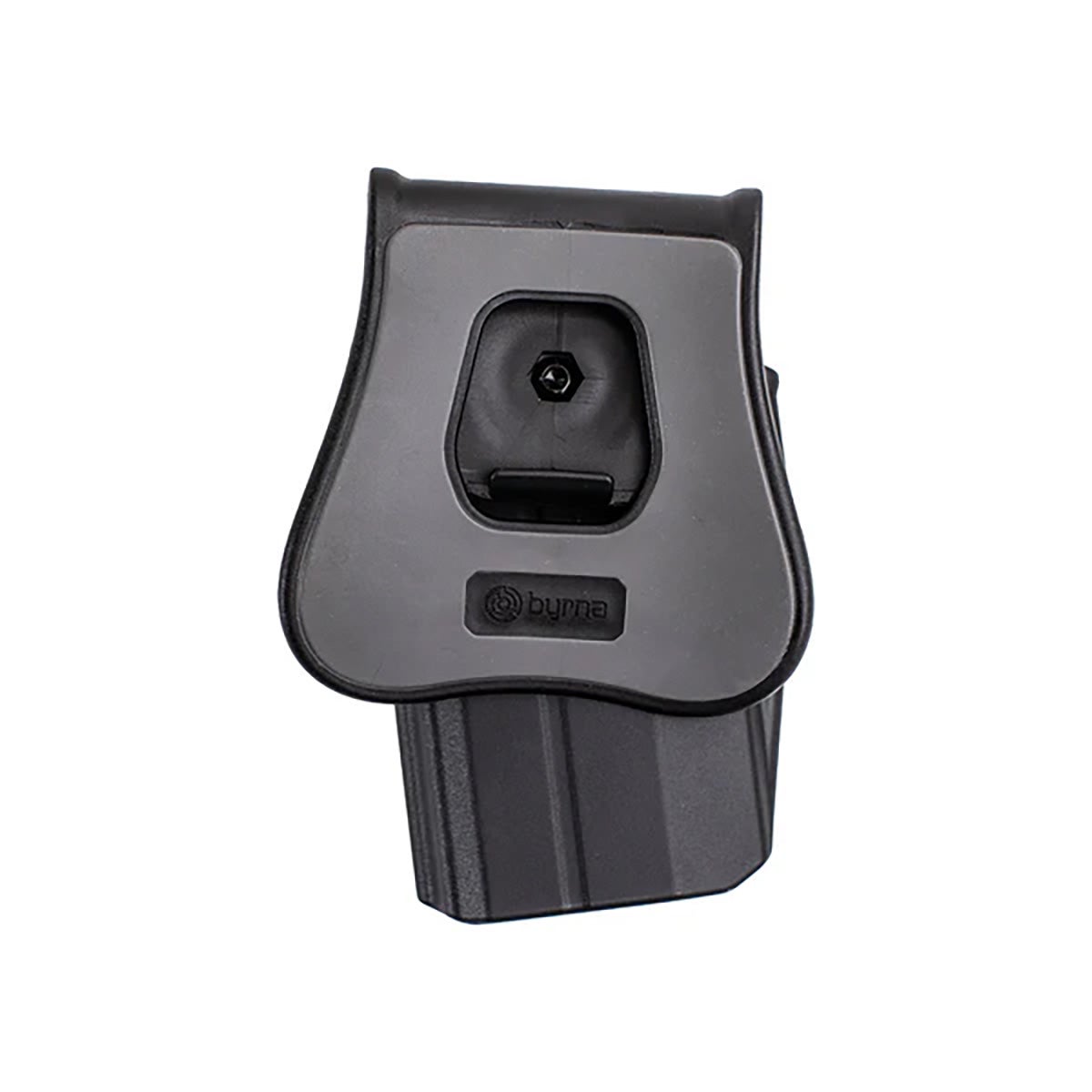 - RETENTION DEVICE: The Level II Holster features a built in retention device that uses the launcher trigger guard to secure your Byrna in the holster. Simply depress the button to draw safely and