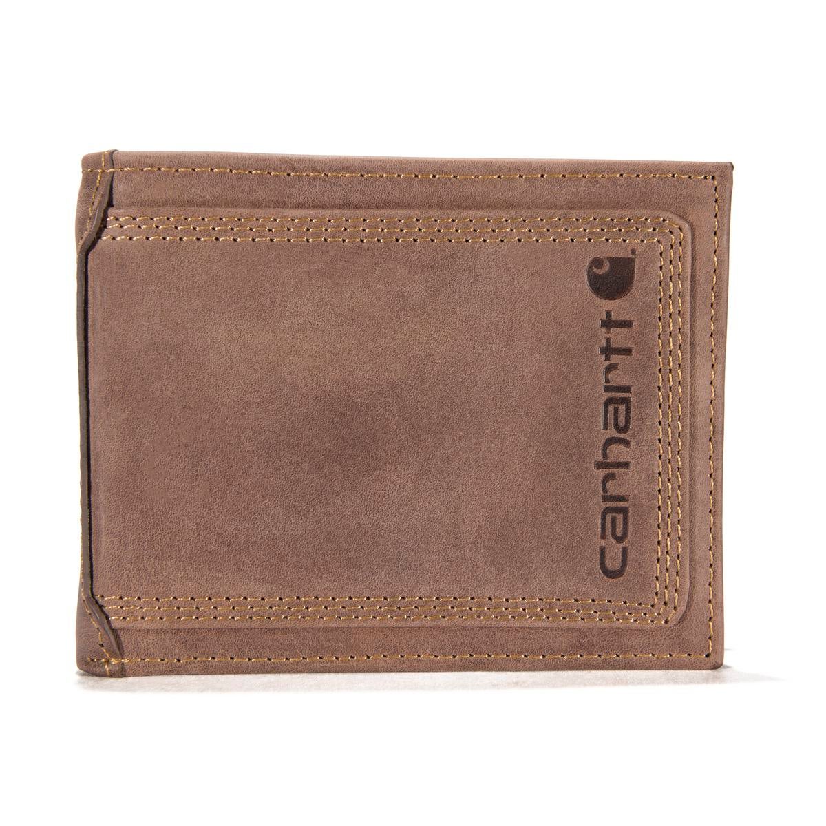 Hand stitching and an embossed Carhartt logo give this men's passcase a rugged look. It's made of top-grain leather, with a sweat-resistant patch that helps keep the wallet dry. The billfold is