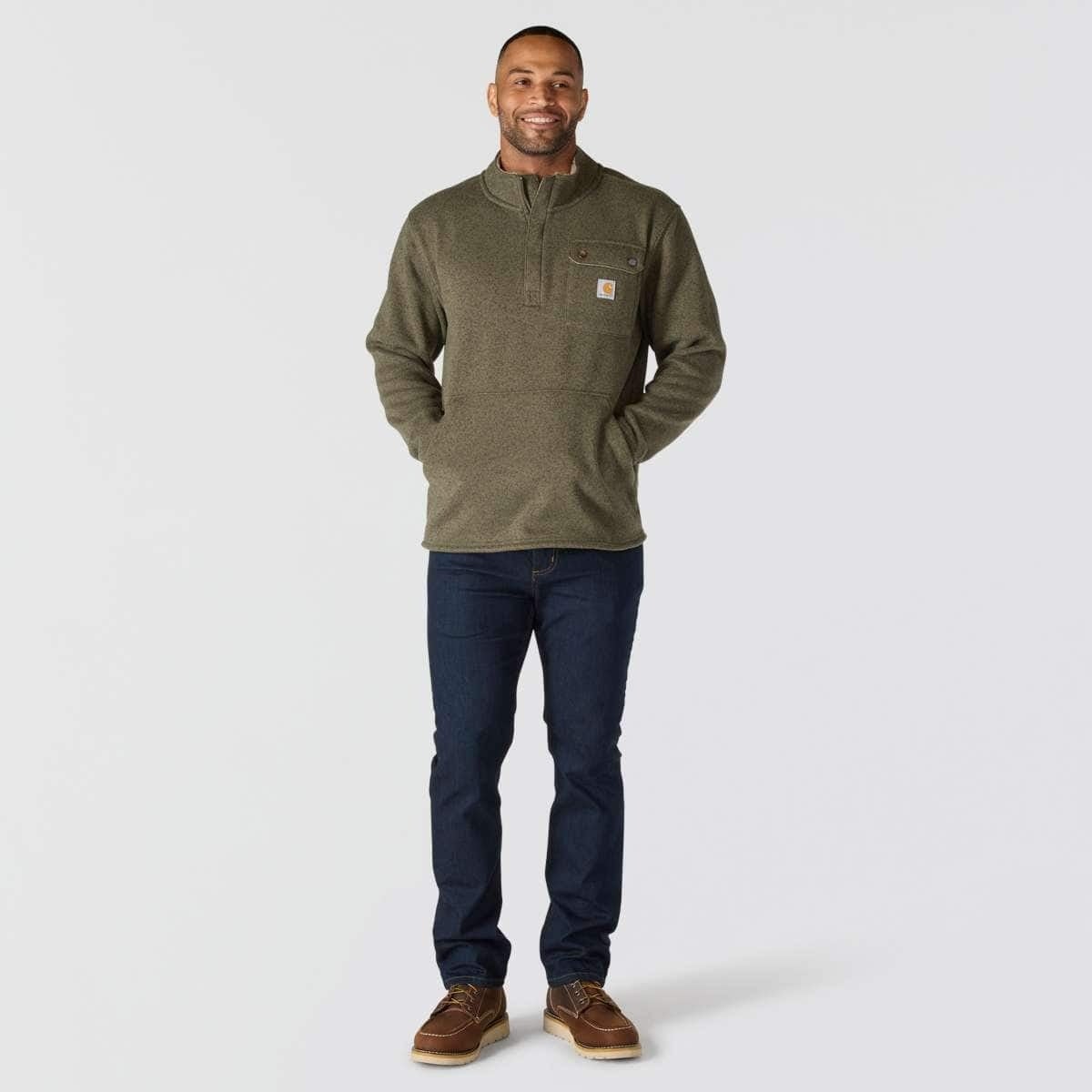 Stay warm when you're working outside. This men's Carhartt fleece sweater is your go-to when the temperatures drop. The collar is lined with sherpa fleece for an extra soft feel. The snap pocket