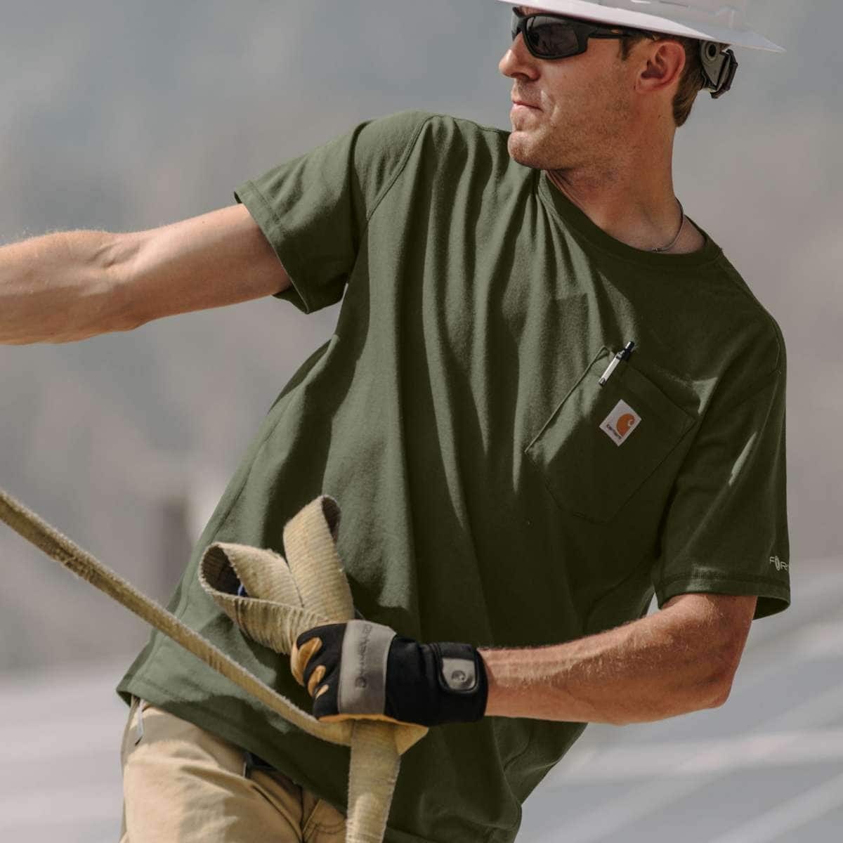 Solids: 5.75-ounce, 65% cotton / 35% polyester stretch plaited jersey knit; Heather gray: 59% cotton / 41% polyester stretch plaited jersey knit; Other Heathers: 60% polyester / 40% cotton stretch pla
