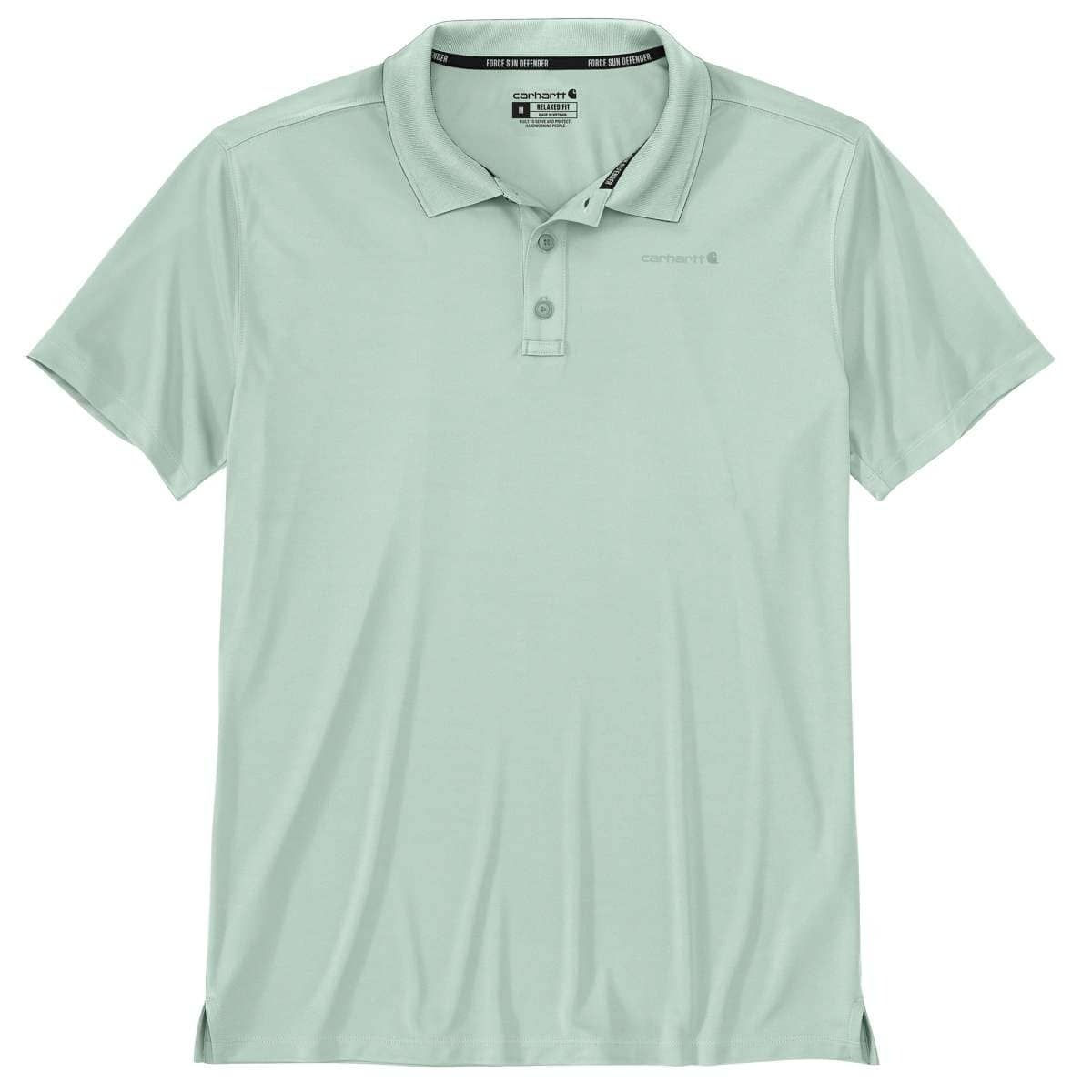 - Carhartt Force sweat-wicking banding at collar; three-button placket