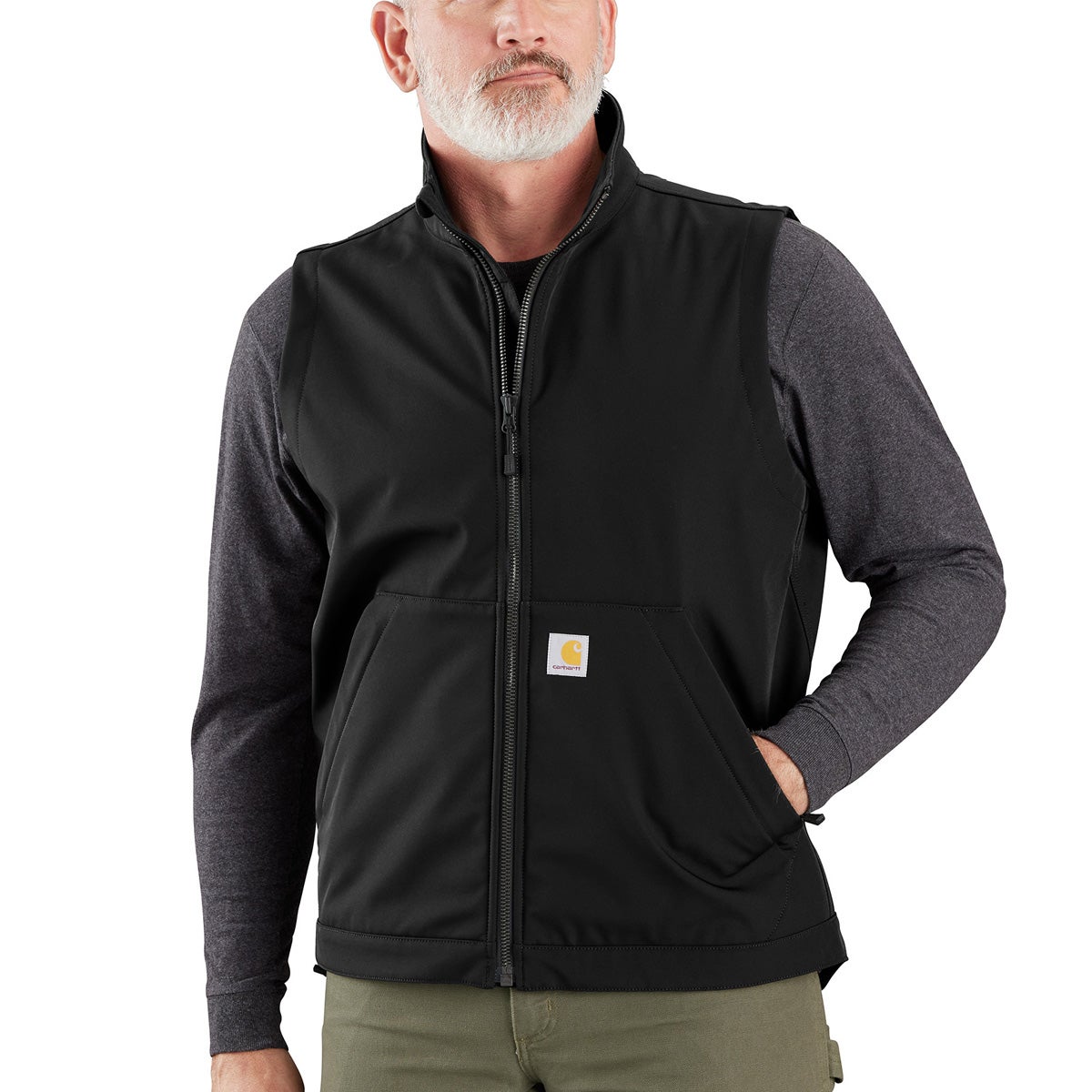 Built for hard-working days and crisp mornings, this men s Carhartt work vest delivers core warmth without the bulk. The durable softshell exterior stands up to the jobsite, while the full-zip designmakes layering easy. A kangaroo pocket keeps hands warm and essentials close, finished with the iconic Carhartt patch up front.