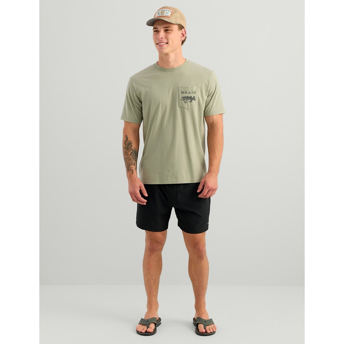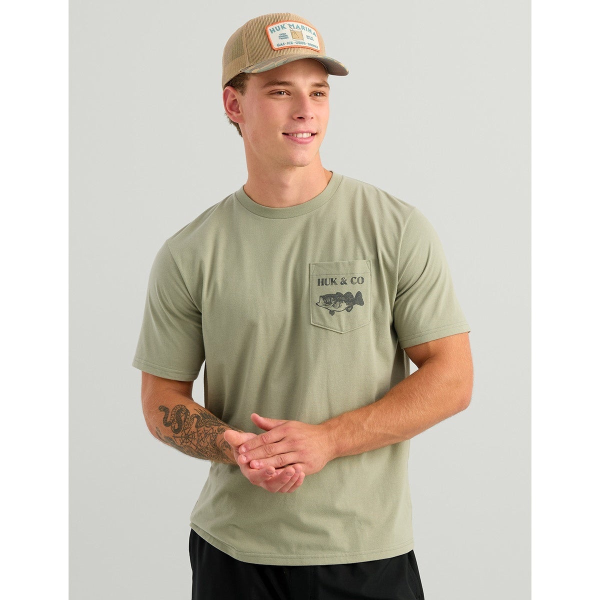 The Huk and Co Pocket Tee blends everyday comfort with angler-ready style. A soft cotton and performance fabric mix keeps it easy to wear from dock to downtime. Finished with a chest pocket graphic upfront and a bold back print that nods to classic fishing supply heritage.
