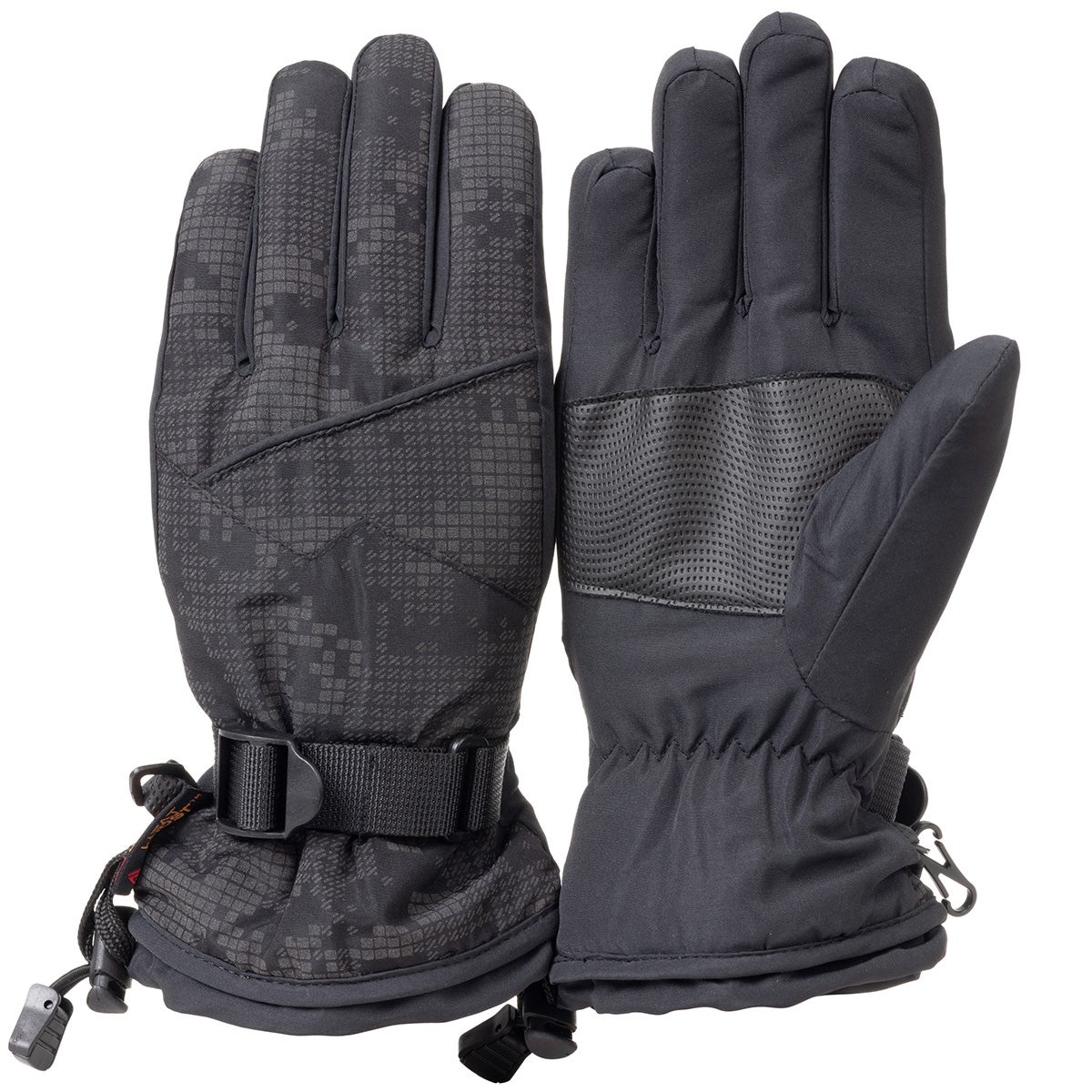 These waterproof ski gloves have it all: a reflective Taslon shell with a gray digital camo pattern and Heat Boost® graphene technology woven into the soft Sherpa lining to for added warmth, wicking away moisture, and fighting odors. A durable synthetic palm gives a grip in challenging weather, and the index finger and thumb are touch screen enabled. Use the web belt for a comfortable fit. Bring on the snow!