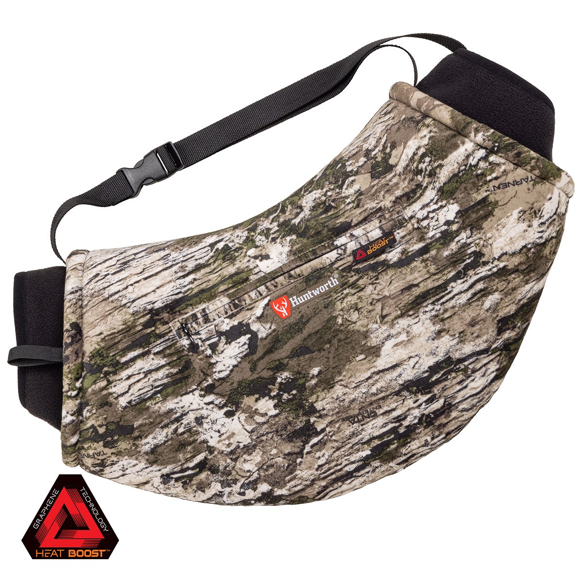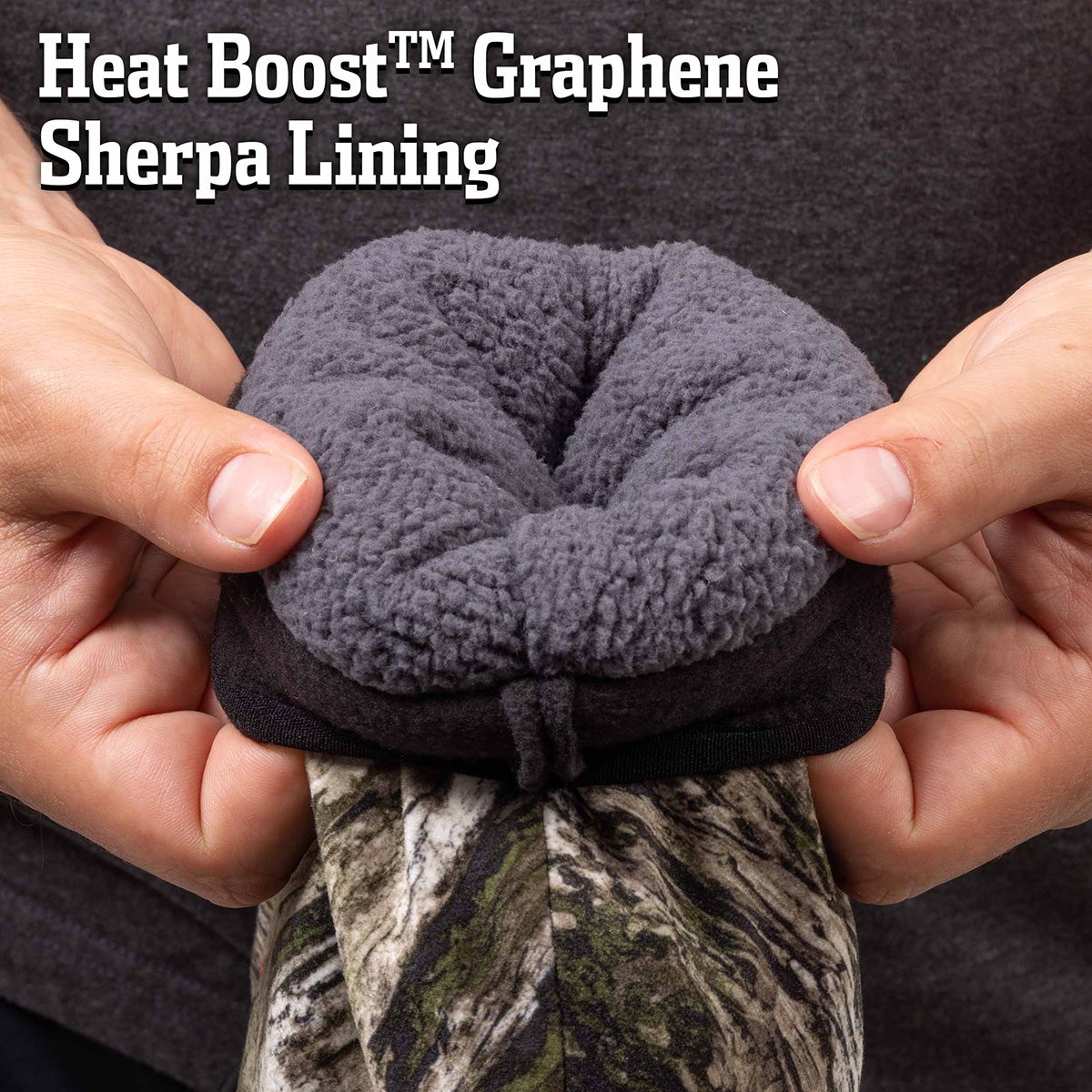 Your hands will never want to leave this ultra-warm hunting muff featuring Heat Boost® graphene technology, the next generation of advanced fabrics. The muff is made with a thick knit jersey in Tarnen® camo with a DWR finish that repels light snow and moisture and a windproof film to block the chill. The interior is fully lined with Heat Boost graphene sherpa, a fabric enhanced with graphene s properties of thermal conductivity, wicking abilities, and odor-reducing capabilities. Knitting graphene yarn into our sherpa lining supercharges it, making a warm material even warmer 30% warmer. Slide your hand inside and you ll feel the heat. Inner fleece cuffs at either end keep the cold air out and the warm air in. A fully adjustable strap makes the muff easy to keep in place, and a pocket holds your gear. Cold fingers are a thing of the past.