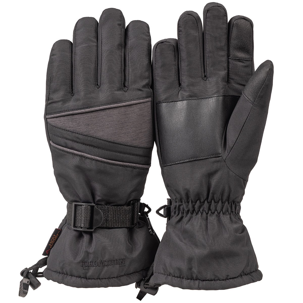 Gear up for the slopes with these stylish and durable Taslon black and heather gray waterproof ski gloves, featuring a polyurethane coating and waterproof membrane to keep you dry. The angled design is a great fit for your ski kit and the gloves are fully lined with Heat Boost® graphene sherpa for the warmth you want without the bulk. Use the touch screen fingertips for your devices and the durable synthetic palm patch for a great grip. With a web belt and cinch cord, you ll stay toasty. These gloves are ready for whatever winter throws at you.