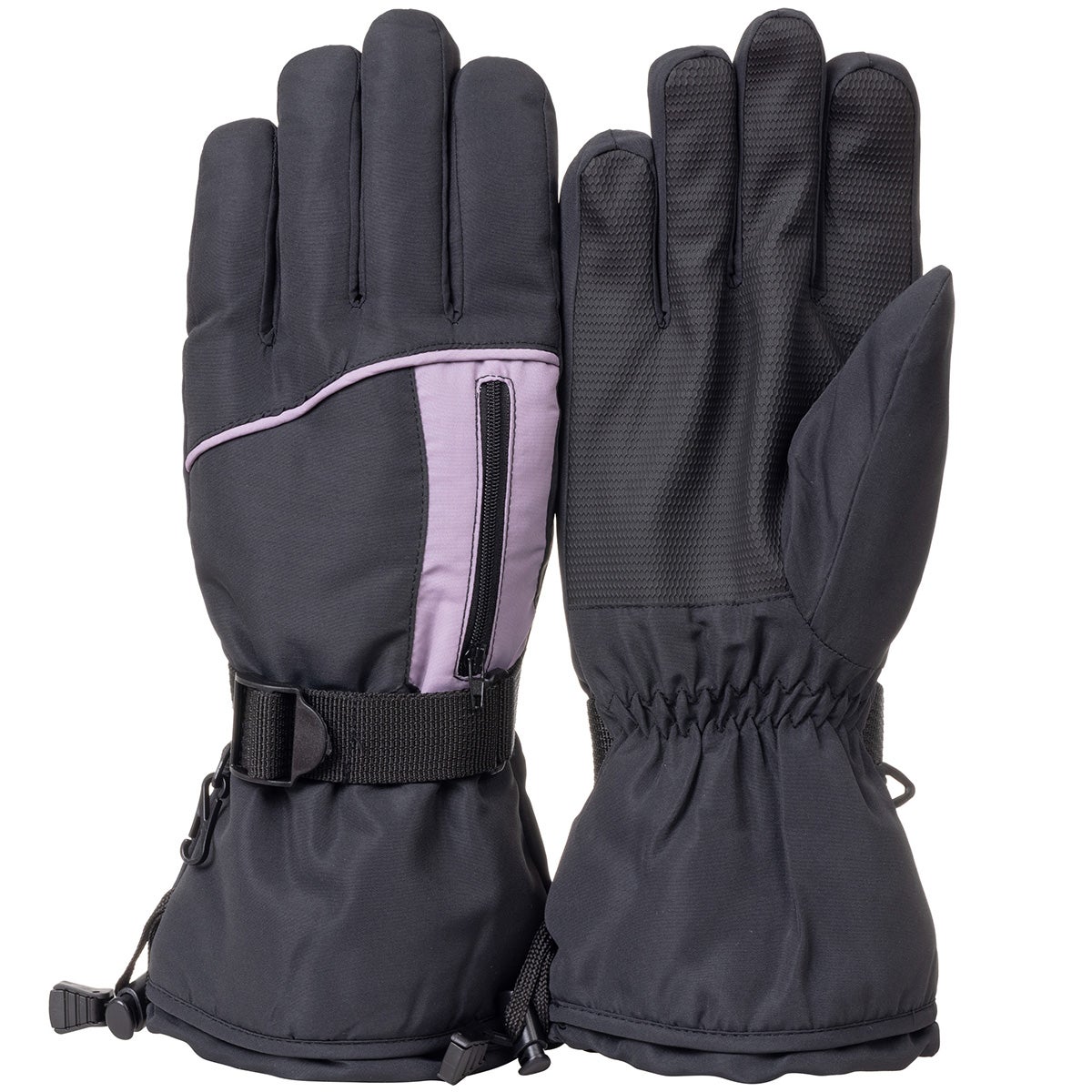 Get ready for the slopes with these classic waterproof ski gloves. Black with a touch of mauve, and a back of hand zip pocket for hand warmers, these gloves will keep out the cold. A luxurious Long Pile fleece lining adds comfort, and a PU palm patch gives you a grip on your poles. A long gauntlet with a cinched wrist and self-adjusting web belt keeps the snow and wind out. These are soon to be your favorite gloves for winter activities.