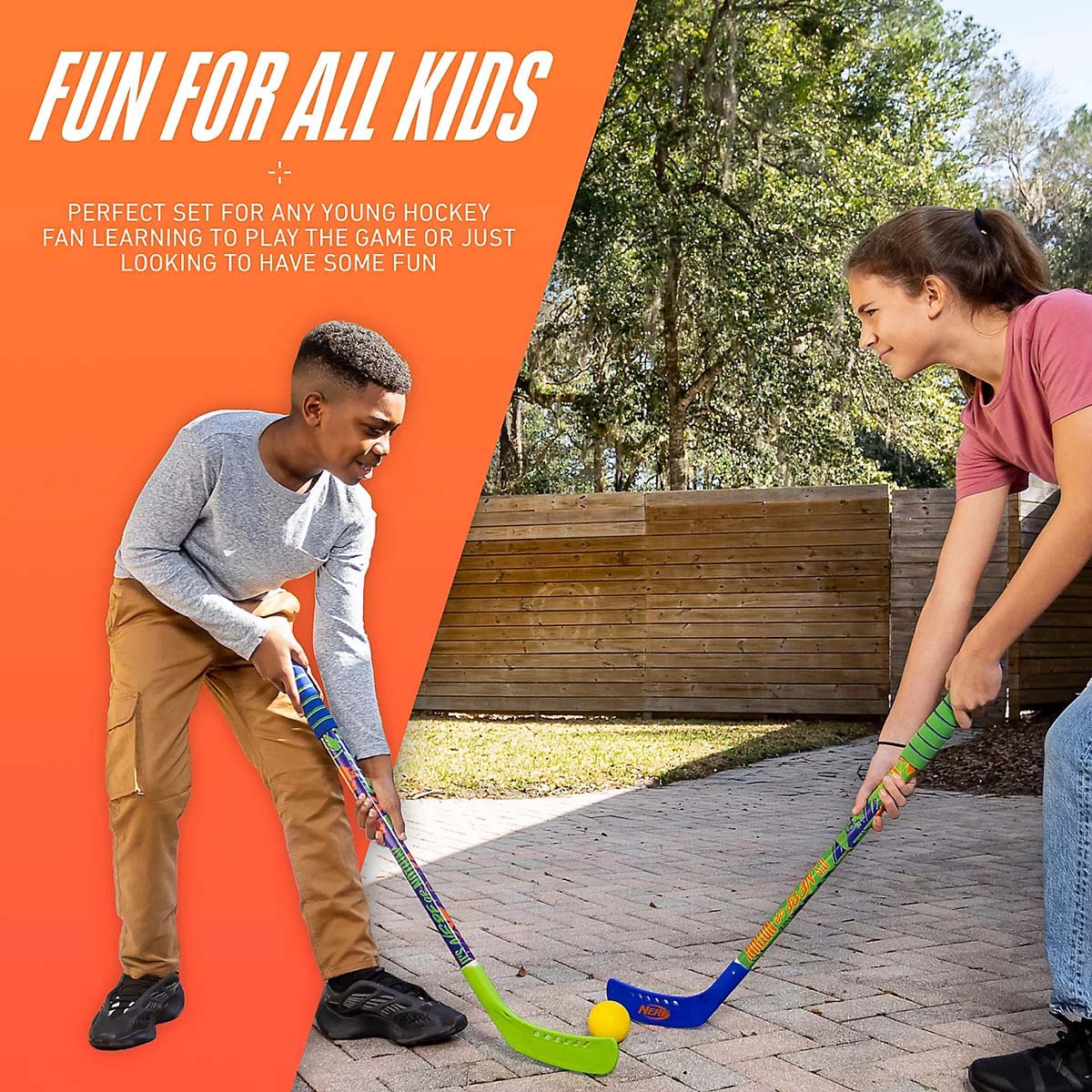 hockey sticks and 1 NERF foam hockey ball. The hockey sticks are adjustable in size so that kids can be included in the game or to let kids switch easily between knee and floor hockey. Designed for