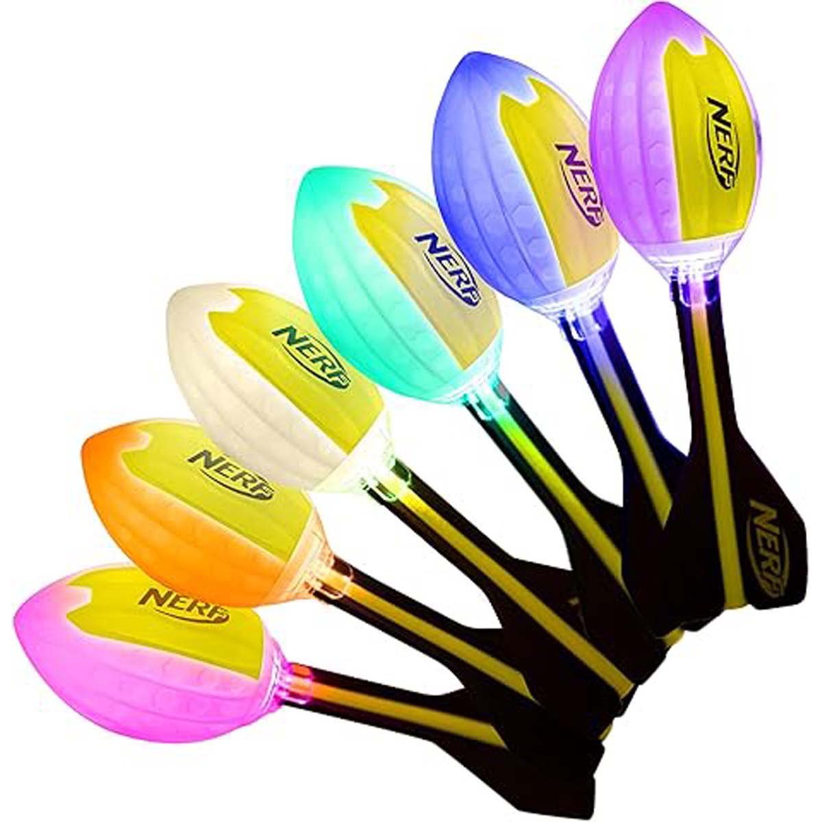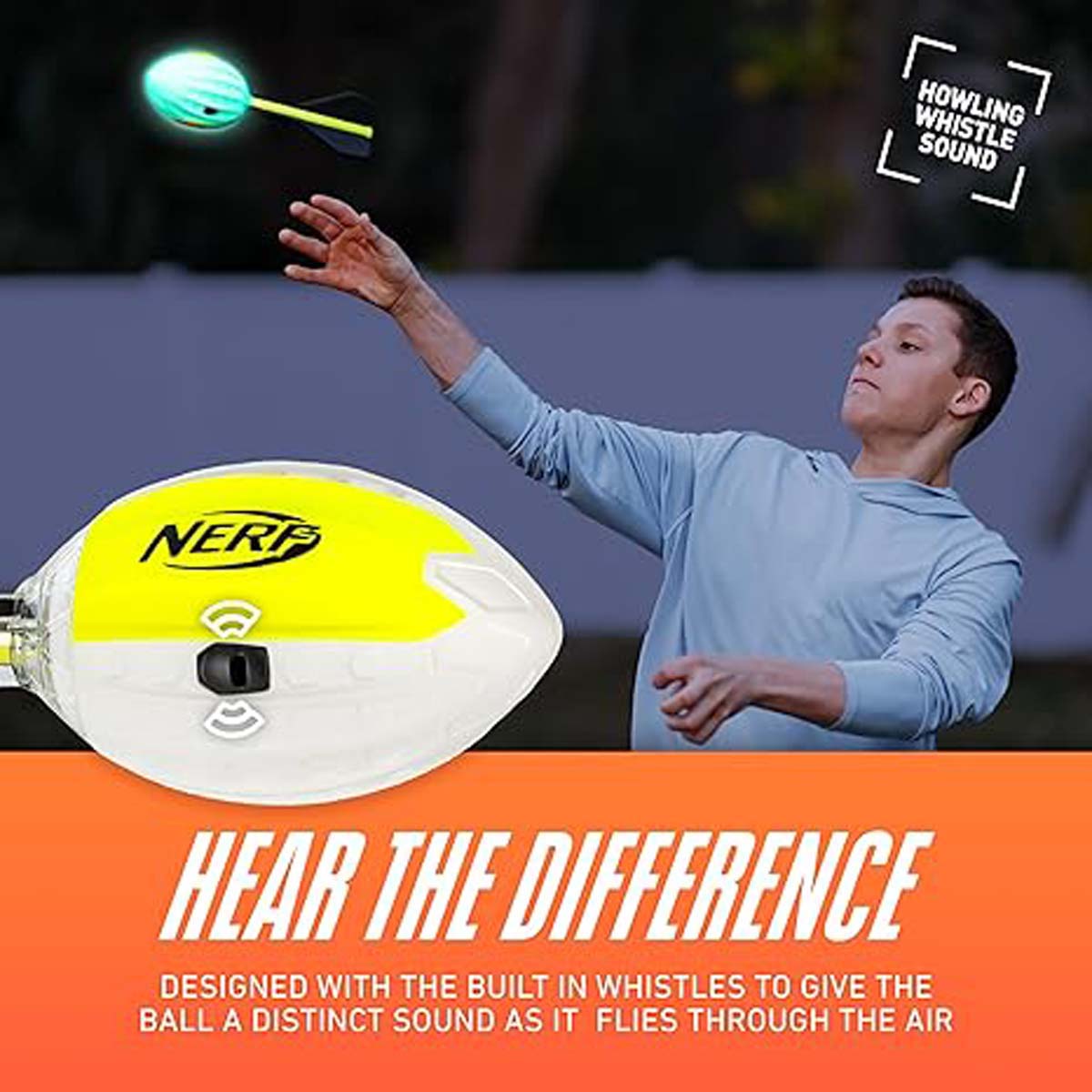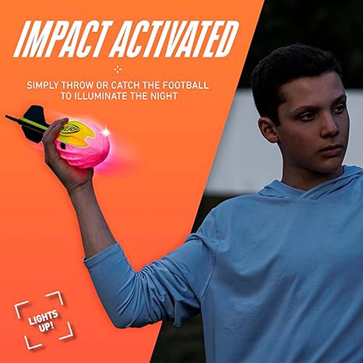 Go deep and go dark with some killer passes with the Nerf Lightstrike Vortex Football! This impact activated LED football illuminates from the inside with a tap and automatically shuts off when notin use. The color changing technology lets you light up the night with red, green and more! Not only see the difference but hear it with the built in whistles! Play indoors or outdoors, the Nerf