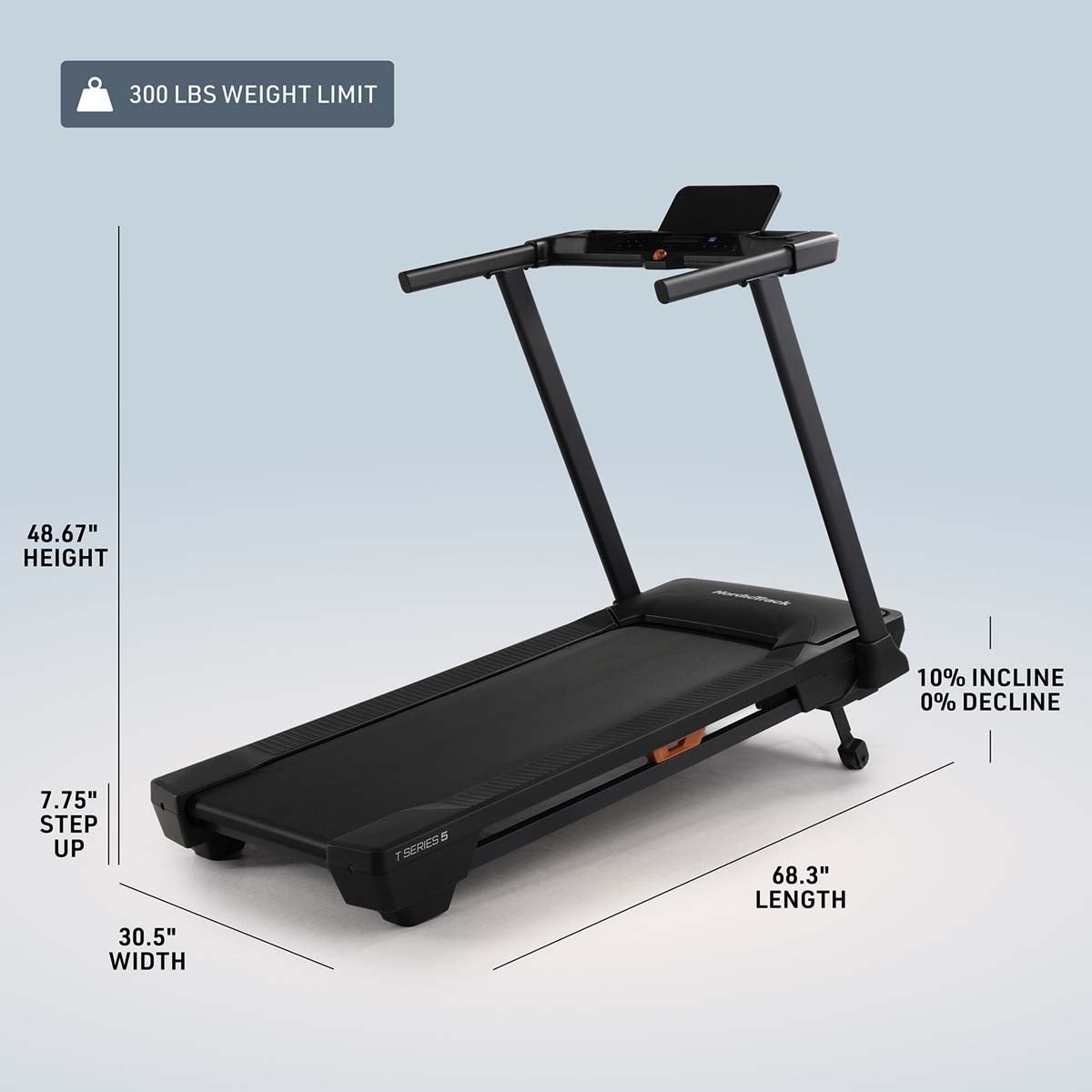 The T Series 5 is equipped with a 5 LCD display for tracking your workout stats and a built-in device shelf, giving you a convenient spot to securely connect and use your own device while you train.The 0-10 MPH speed range allows you to run up to a 6-minute-mile pace. A 0-10% incline can gradually slope, simulating hill terrain and making your workout more intense and effective. The KeyFlex cushioned deck provides superior shock absorption for comfortable walking, jogging, or running, perfect for users looking for a joint-friendly treadmill. With a more compact running surface, the T Series5 delivers a NordicTrack experience in a space-saving footprint. About iFIT: iFIT offers over 10,000 workouts led by professional athletes and fitness experts. With the included 1-month iFIT Train Membership*, you can access a wide range of training programs, including strength, yoga, HIIT, and more. iFIT's SmartAdjust technology personalizes each workout to your fitness level, and ActivePulse