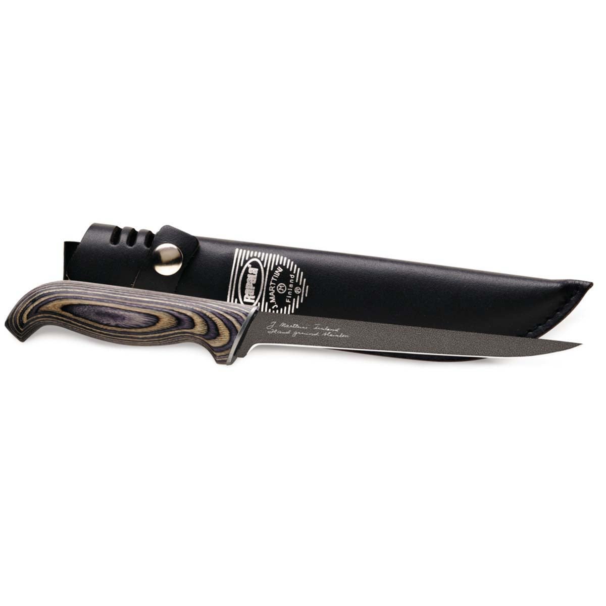 Crafted by Marttiini, this Presentation Fillet Laminates fillet knife pairs modern Nordic styling with a premium laminated birch handle. A hand-ground European stainless steel blade and progressivetaper deliver controlled slicing from tip to tang. Finished with through-tang construction and a coordinated genuine leather sheath, it?s built for confident work at the cleaning table and easy