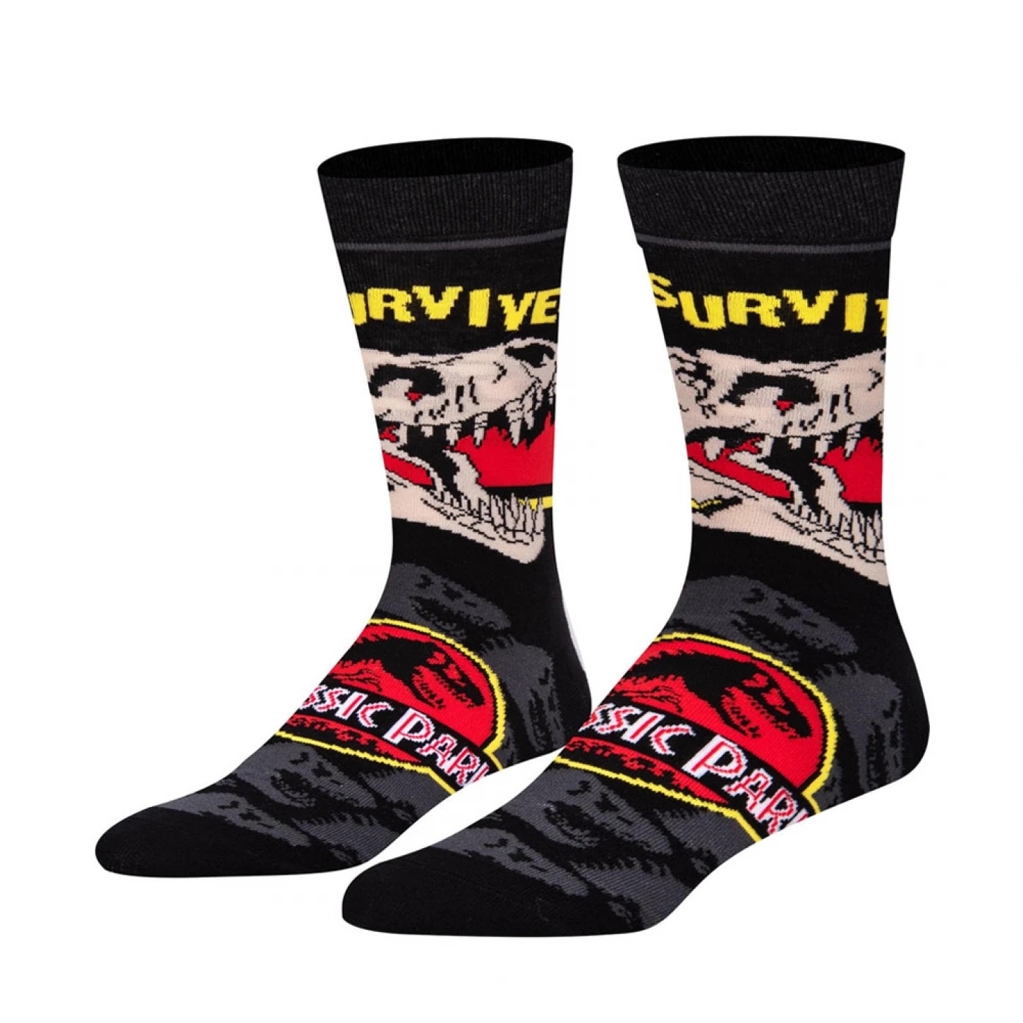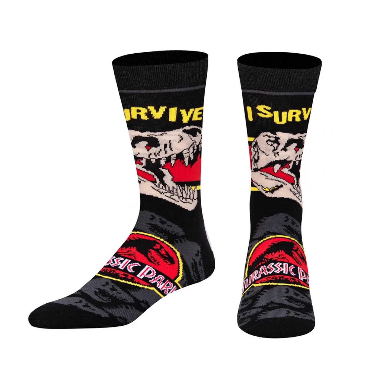 Show your dino pride with these crew socks featuring the iconic Jurassic Park graphics and bold I Survived text. A cushioned knit delivers everyday comfort in a breathable, stretchy fit. Perfect forfans and casual wear, they add a pop of character to sneakers or boots.
