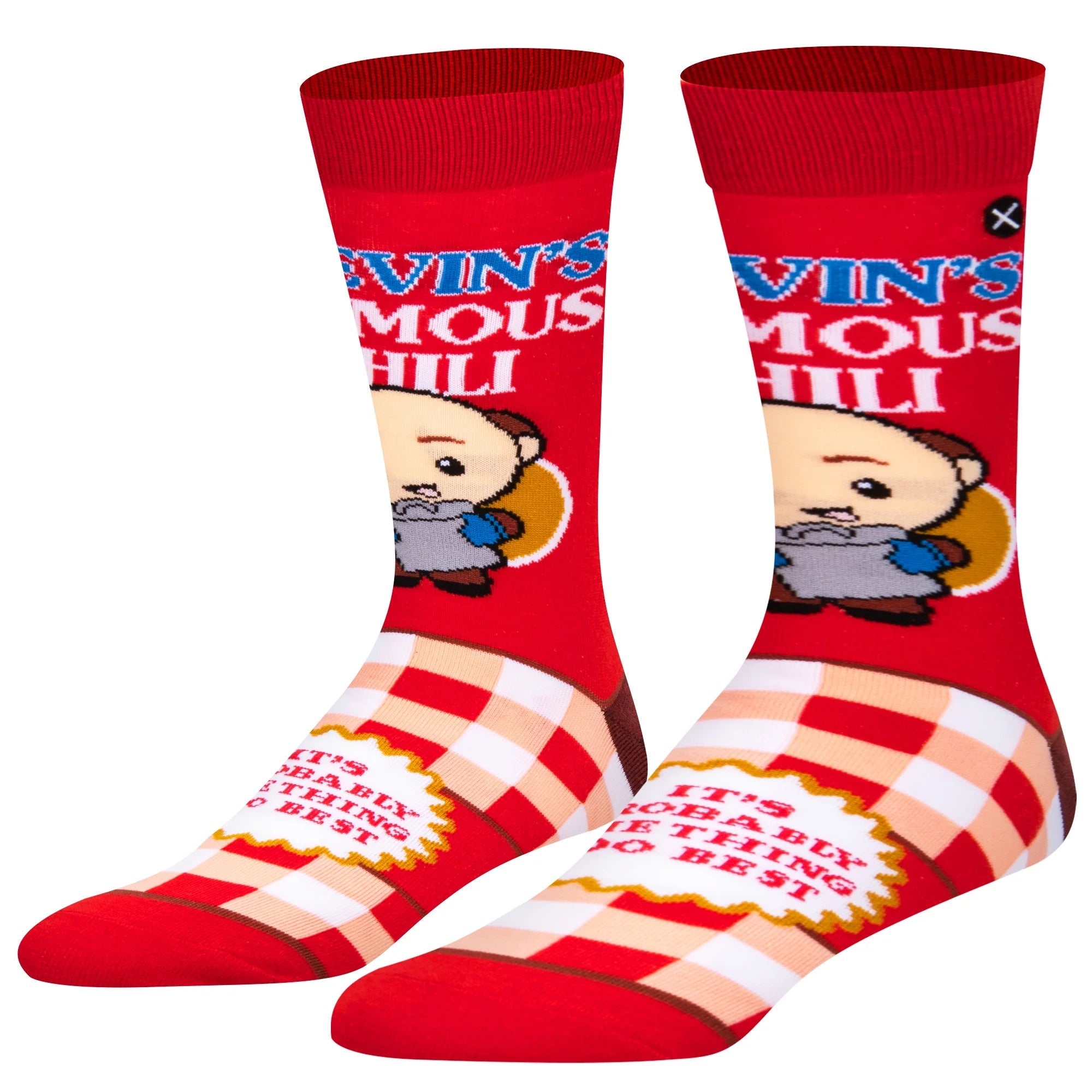 Turn every step into a fan moment with these bold red crew socks inspired by Kevin s iconic chili. A vivid graphic and playful picnic-check pattern bring character to your everyday rotation while soft, stretchy knit keeps you comfortable. Perfect for gifting or wearing to your next rewatch, they add a pop of color and humor to any outfit.