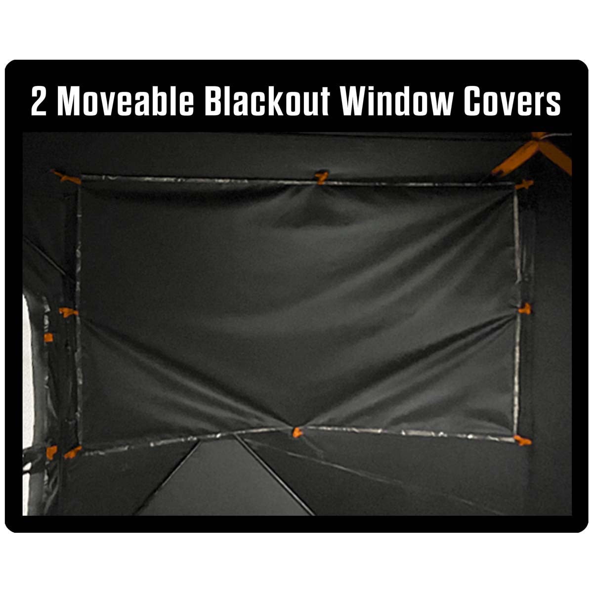 - 7 total silent-slide windows - 2 horiztonal windows with adjustable, blackout curtains, 4 corner windows that are ideal for archery, and 1 center triangle window with magnets