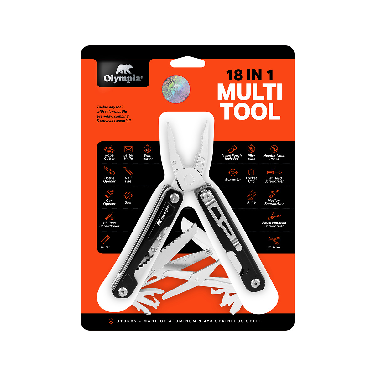 Be ready for bigger jobs with the Olympia Bolt 18-in-1 Multi Tool, built for strength, versatility, and everyday reliability. Packed with essential tools in one compact design, it's perfect for tackling repairs, outdoor tasks, and on-the-go fixes. Durable and easy to carry, it's a must-have for your gear, toolbox, or pack.