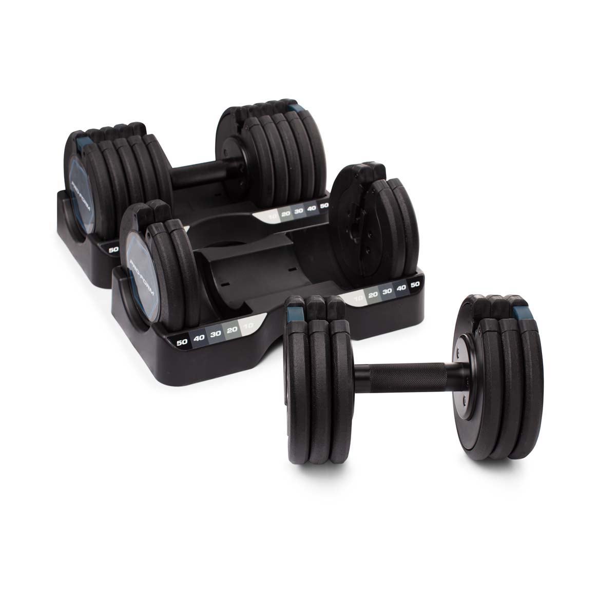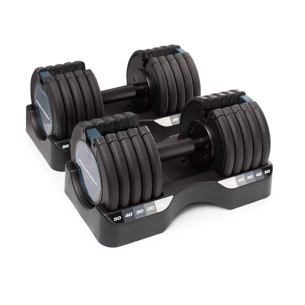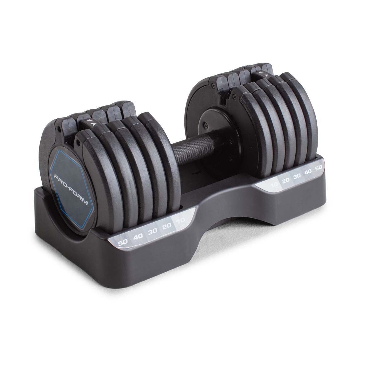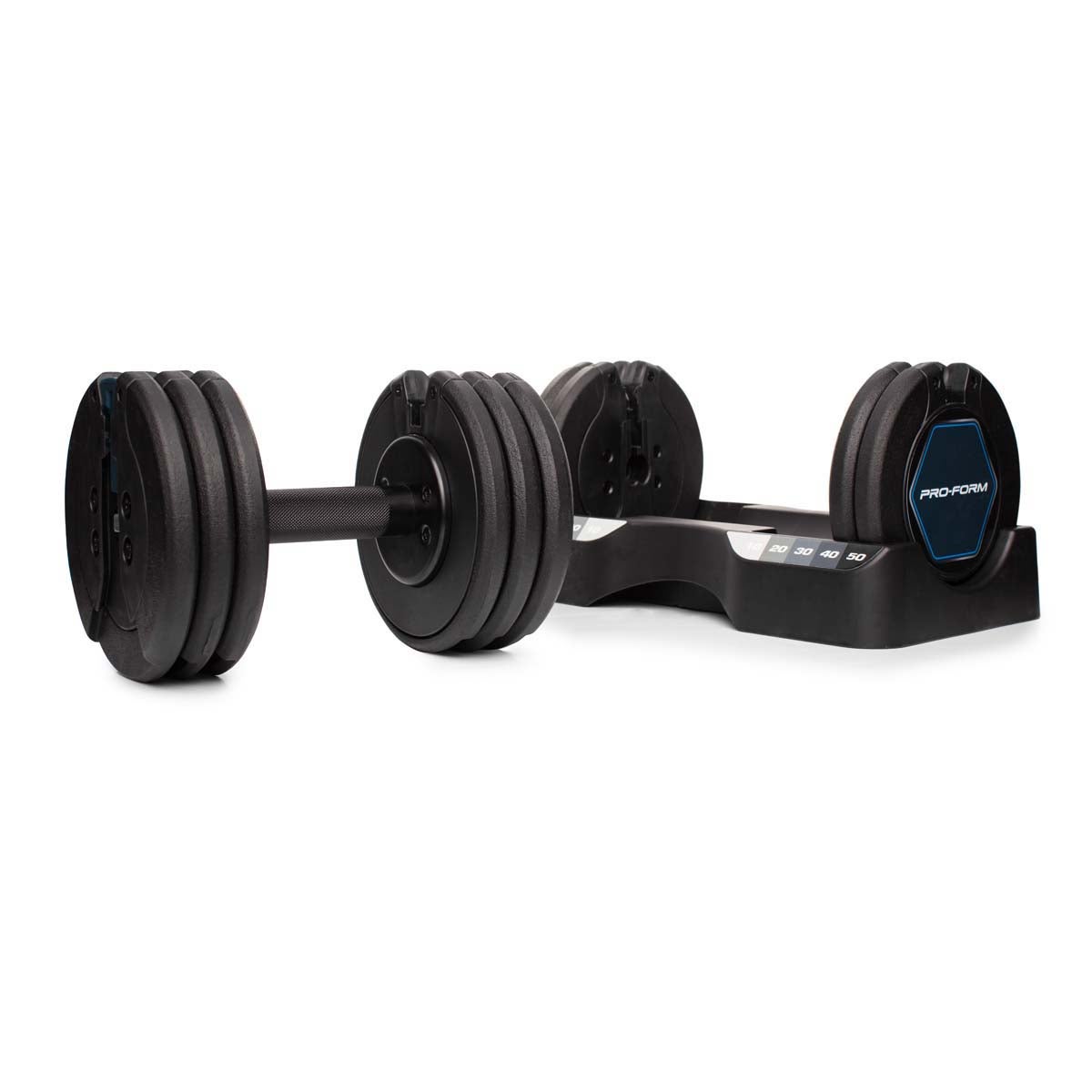 With the ProForm Rapid Strike 50 Lb. Adjustable Dumbbell Set, each dumbbell can become five dumbbells. Quickly modify each dumbbell in 10-pound increments, from 10 to 50 pounds. Based on yourfitness level, you can turn one dumbbell into a 10 pound, 20 pound, 30 pound, 40 pound, or 50 pound dumbbell. With an iFIT membership, you can use your phone, tablet, or TV to follow expert iFIT