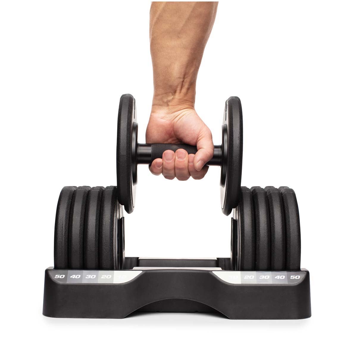 - Five Dumbbells in One: Each dumbbell goes from 10 to 50 Lb. in 10-pound increments.