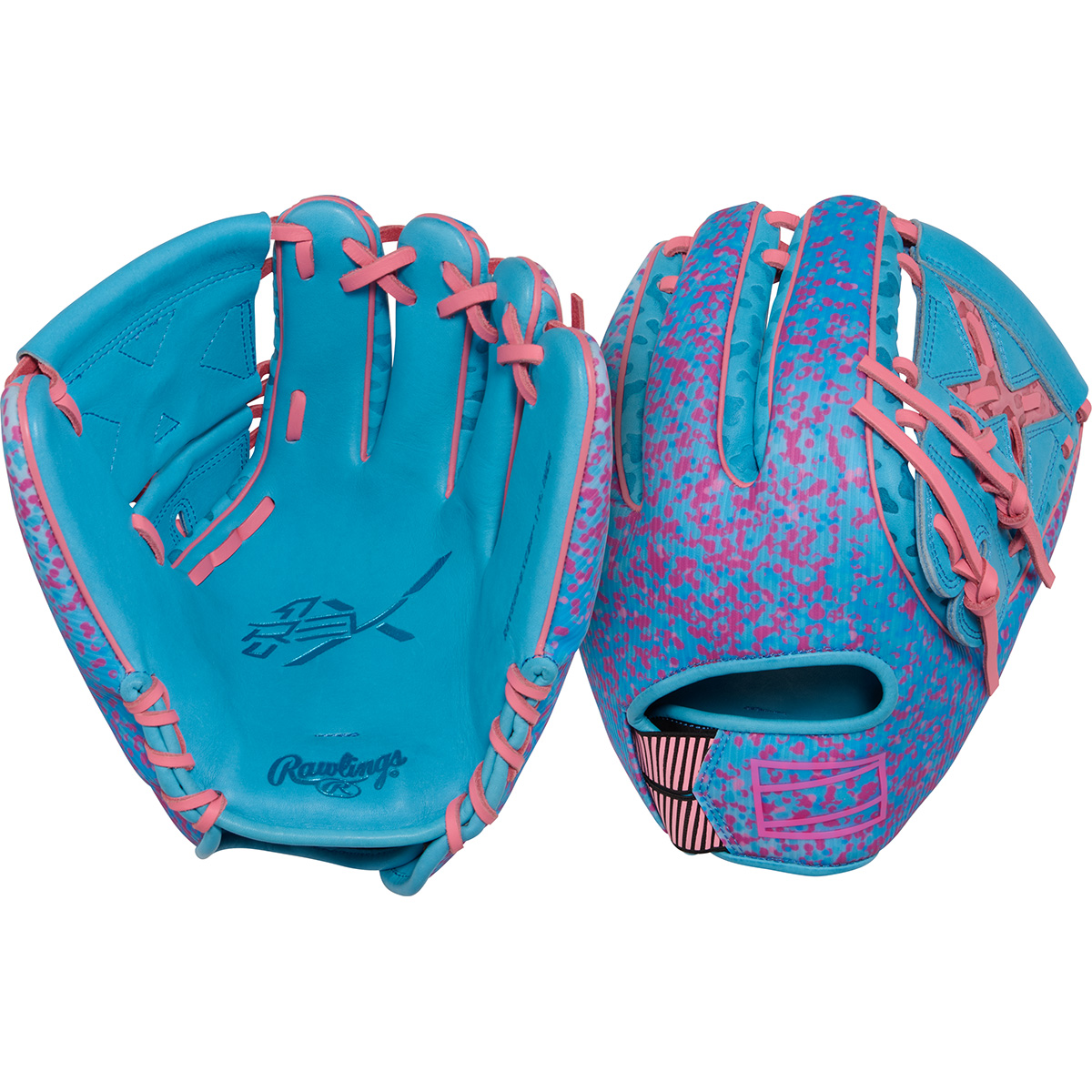 Turns heads on the field with the exclusive Rawlings REV1X 11.75-inch infield glove! This glove's vibrant design features a stunning blue and pink speckled pattern that pops with energy and flair.