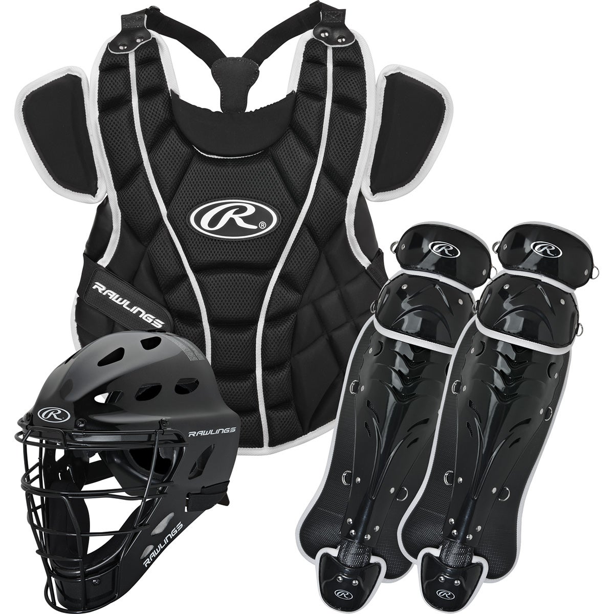 the Rawlings Storm Softball Catcher's Set - Youth, a dynamic and meticulously designed ensemble tailored specifically for young and aspiring softball catchers. The Storm series by Rawlings is synonymous with quality, performance, and innovation, and this youth catcher's set in a sleek black color scheme is no exception.