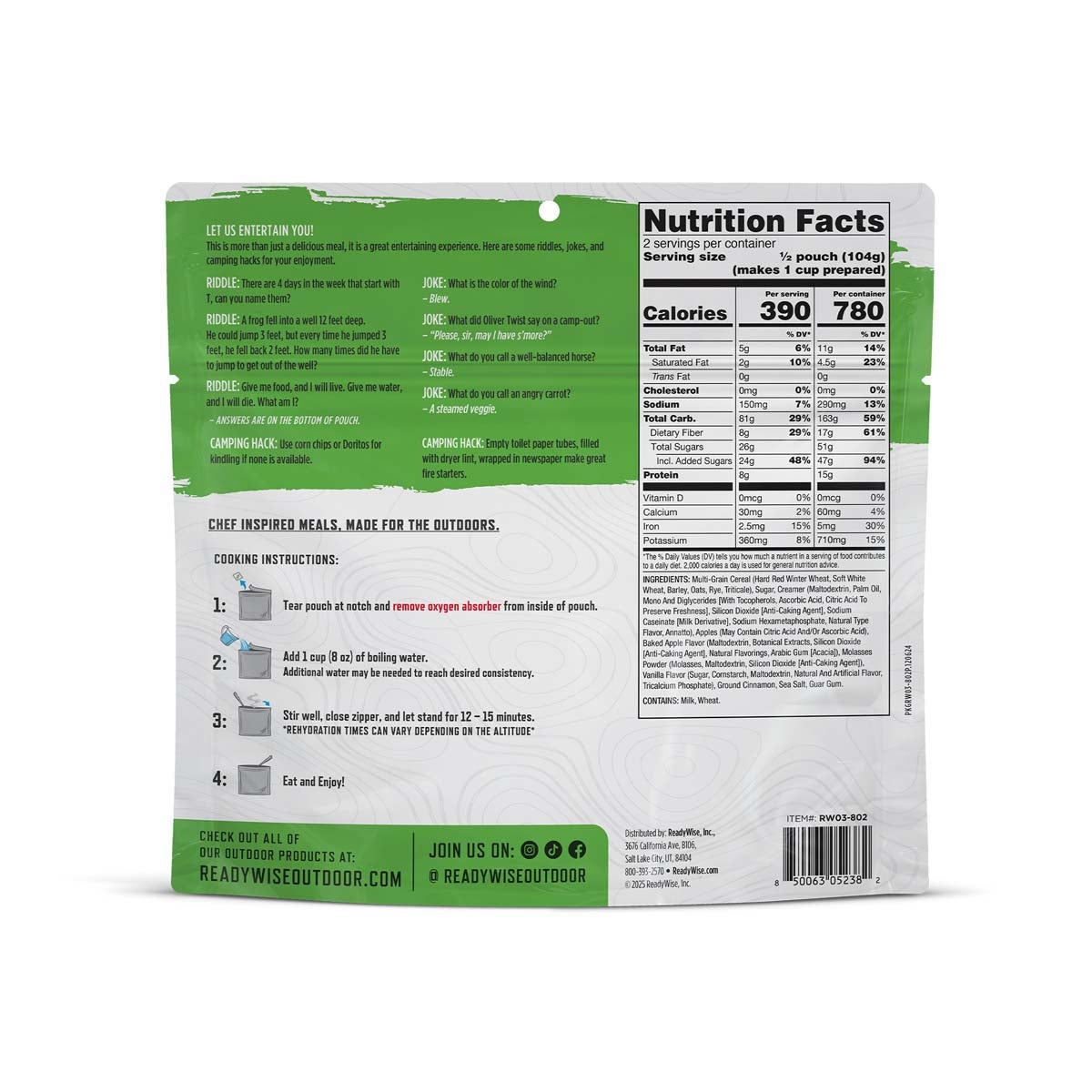 Each pouch of Apple Cinnamon Cereal contains 2 servings and is resealable. These pouches are lightweight making the easily portable for any outdoor adventure. Just add water and you can eat
