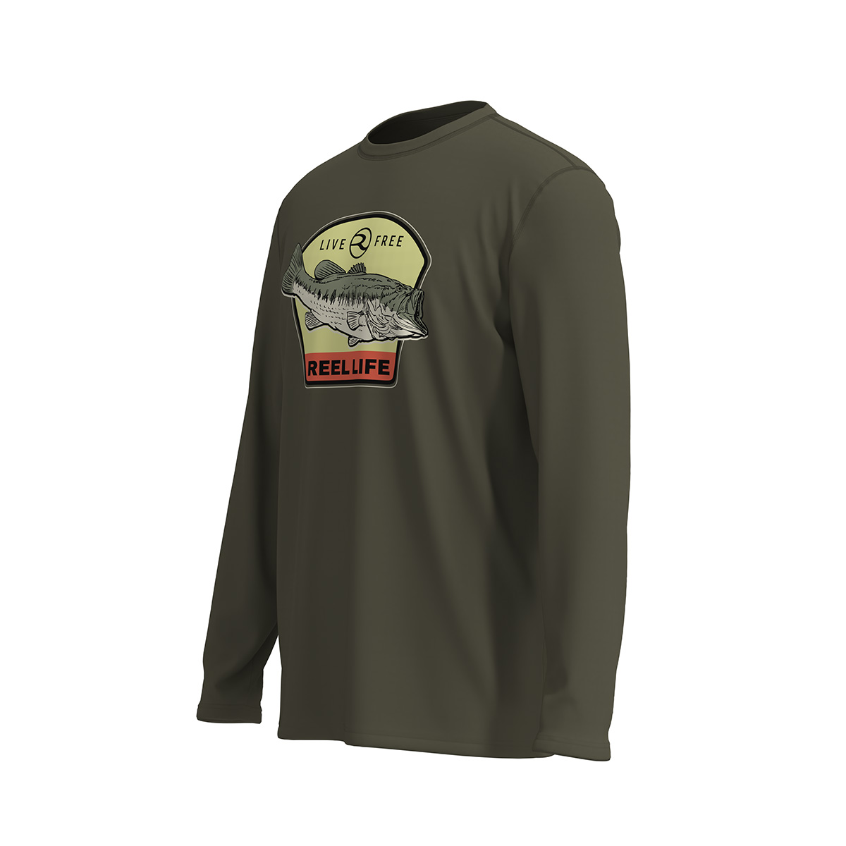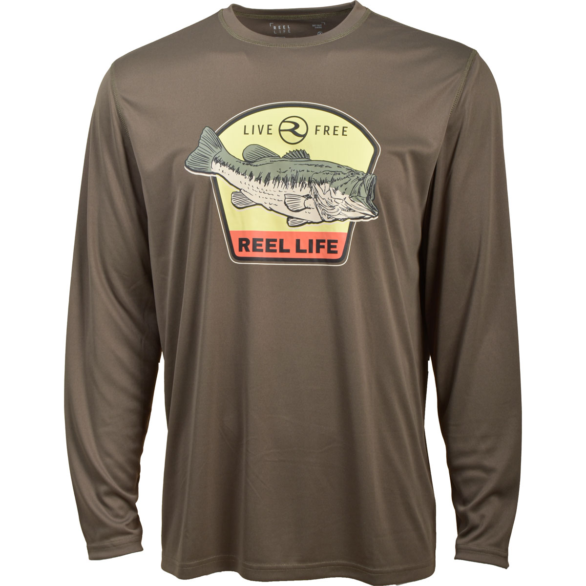 - Vintage-style "Live Free / Reel Life" bass badge graphic on the front