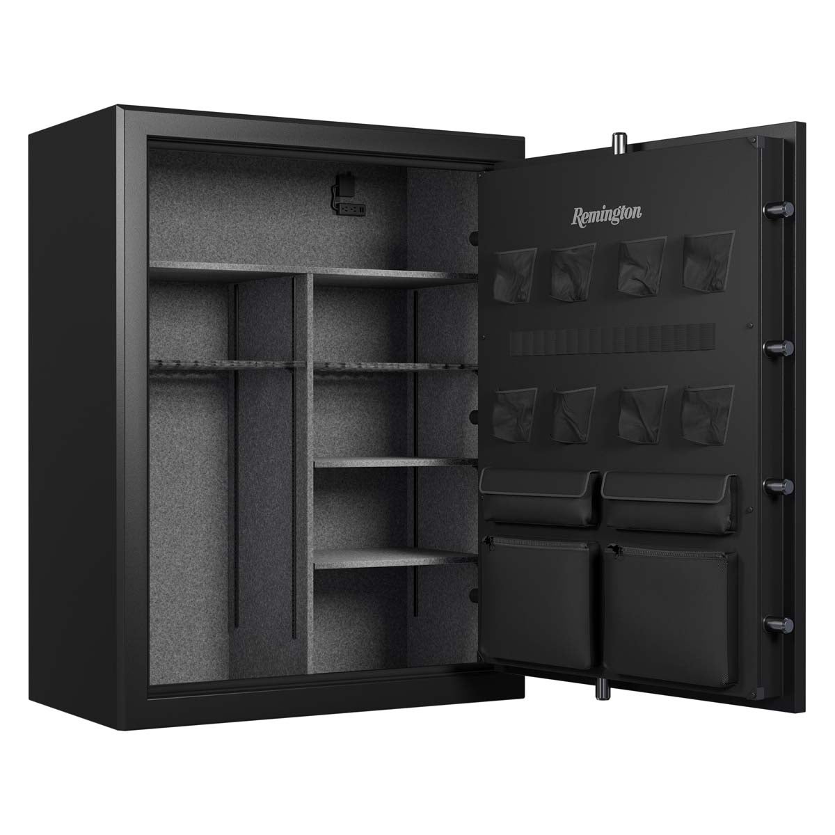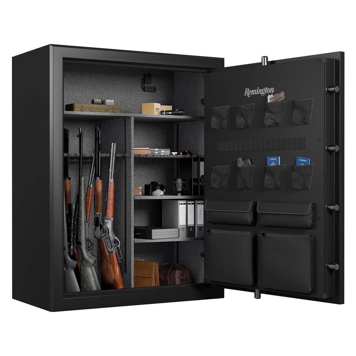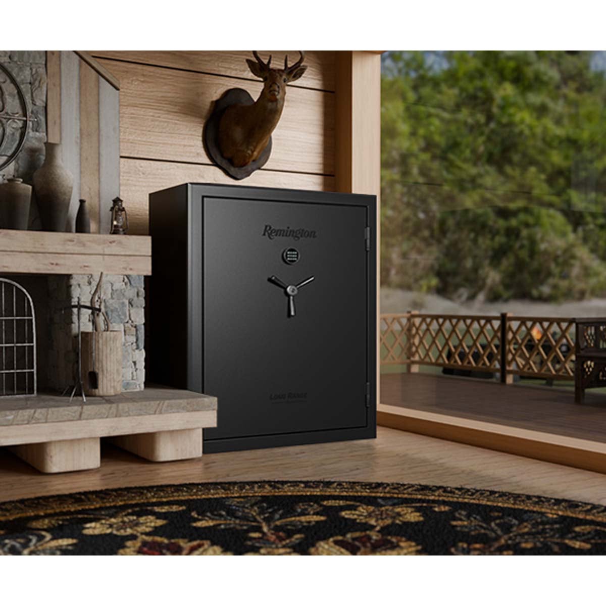 This safe features premium embossed Remington brand detailing on the door organizer and comes in an Hammertone Black Gloss finish. The Remington Long Range 80-Gun Fire/Waterproof Safe is meticulouslydesigned for avid hunters and collectors who prioritize safeguarding their valuables. Its robust security features include an Illuminated Electronic Lock, 14-gauge steel body, and 9 solid steel
