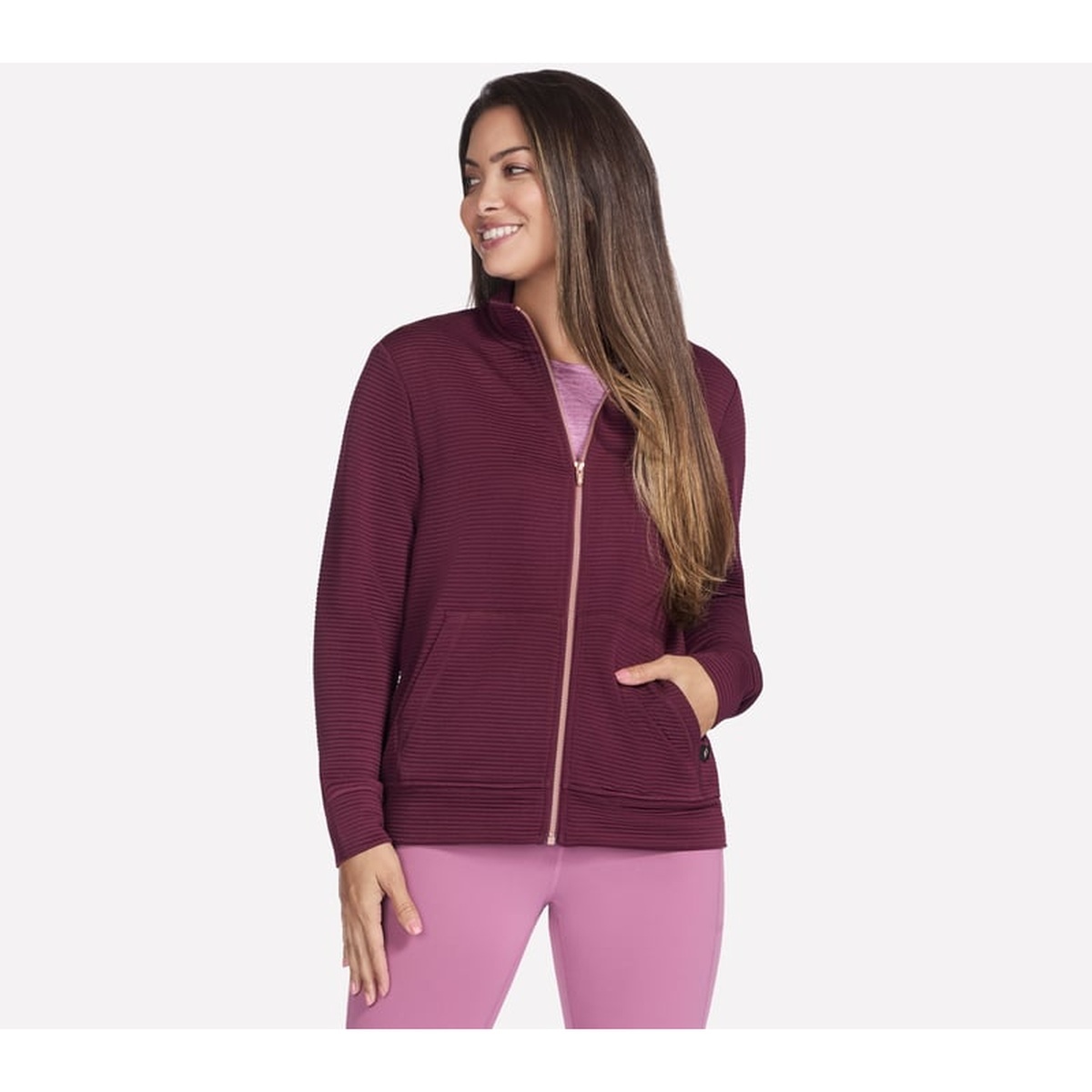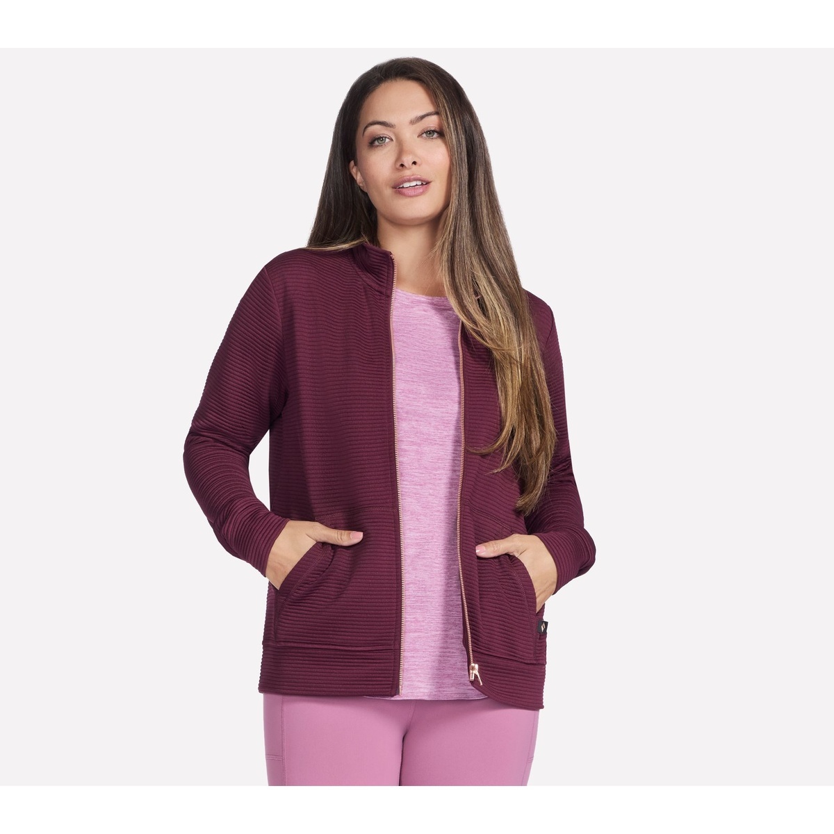 Everyday style meets cozy comfort in the Skechers GO WALK Everywhere Jacket. Designed in a classic fit with a mock neck and full-zip front, it layers easily over tees and tanks for warmups, travel days, and off-duty wear. Soft-Knit jersey rib adds a plush feel, while the split kangaroo pocket keeps essentials close.