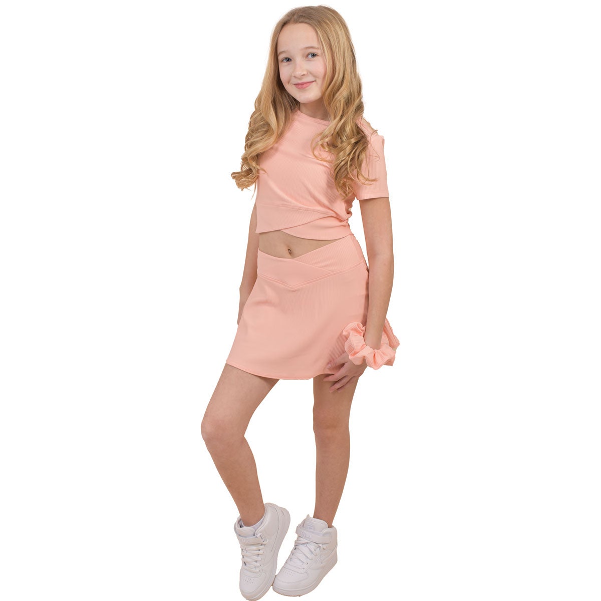 The SOLA Girls' Ribbed Crossover Top & Skort Set with Jumbo Scrunchie delivers a coordinated, trend-forward look designed for comfort and movement. Crafted from soft ribbed fabric, this matchingset pairs a flattering crossover short sleeve top with a crossover waistband skort for an easy, sporty silhouette. Finished with a matching jumbo scrunchie, this set is perfect for active days, casualoutings, or everyday wear.