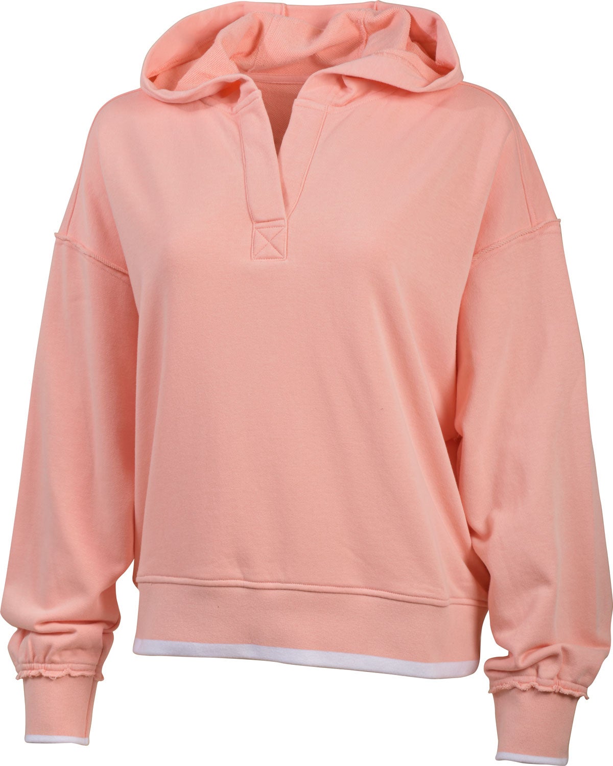 The SOLA Women's Stone Wash Baby Terry Salina Hooded Long Sleeve Top blends cozy comfort with a modern, relaxed edge. Featuring a front placket opening, raw edge hem, and contrast