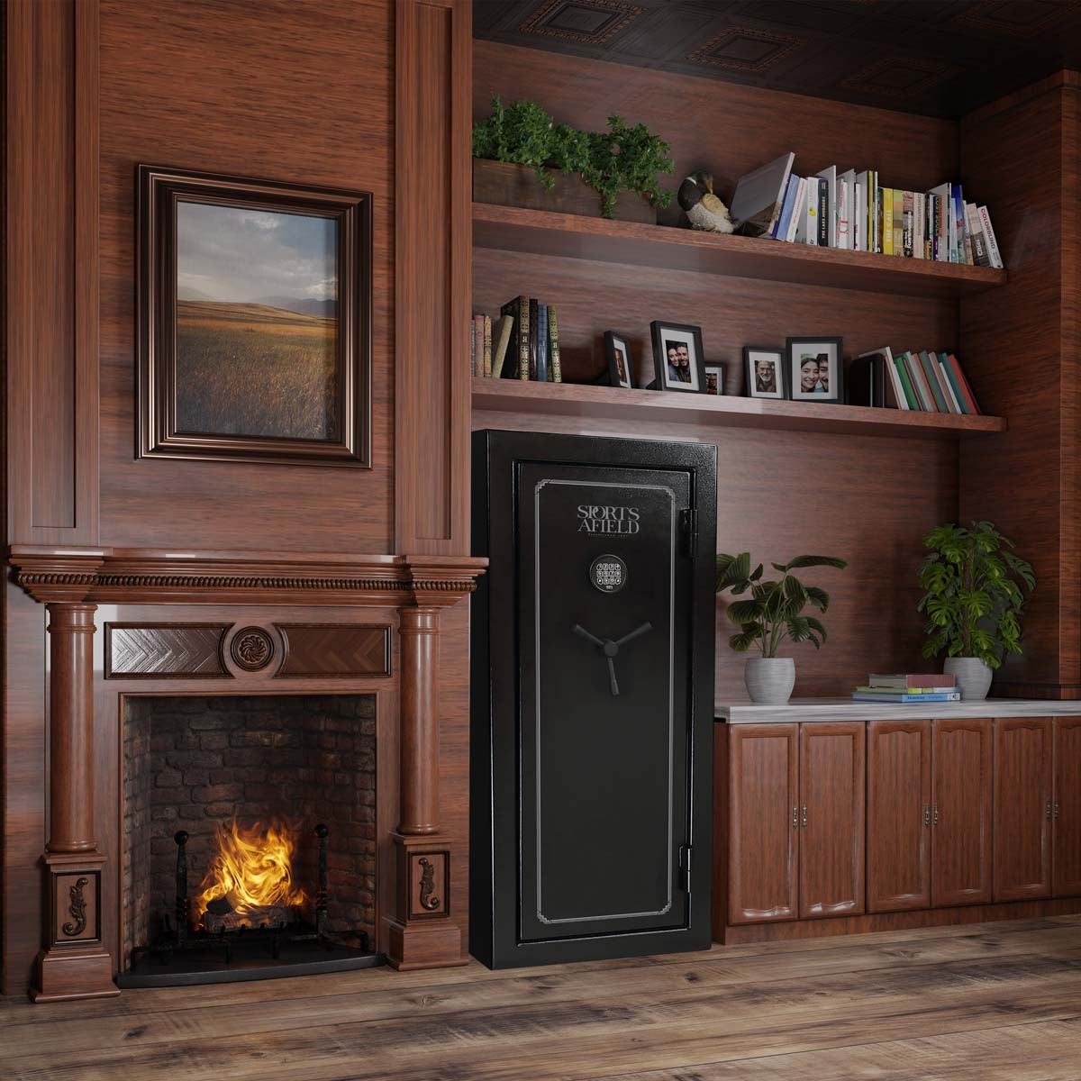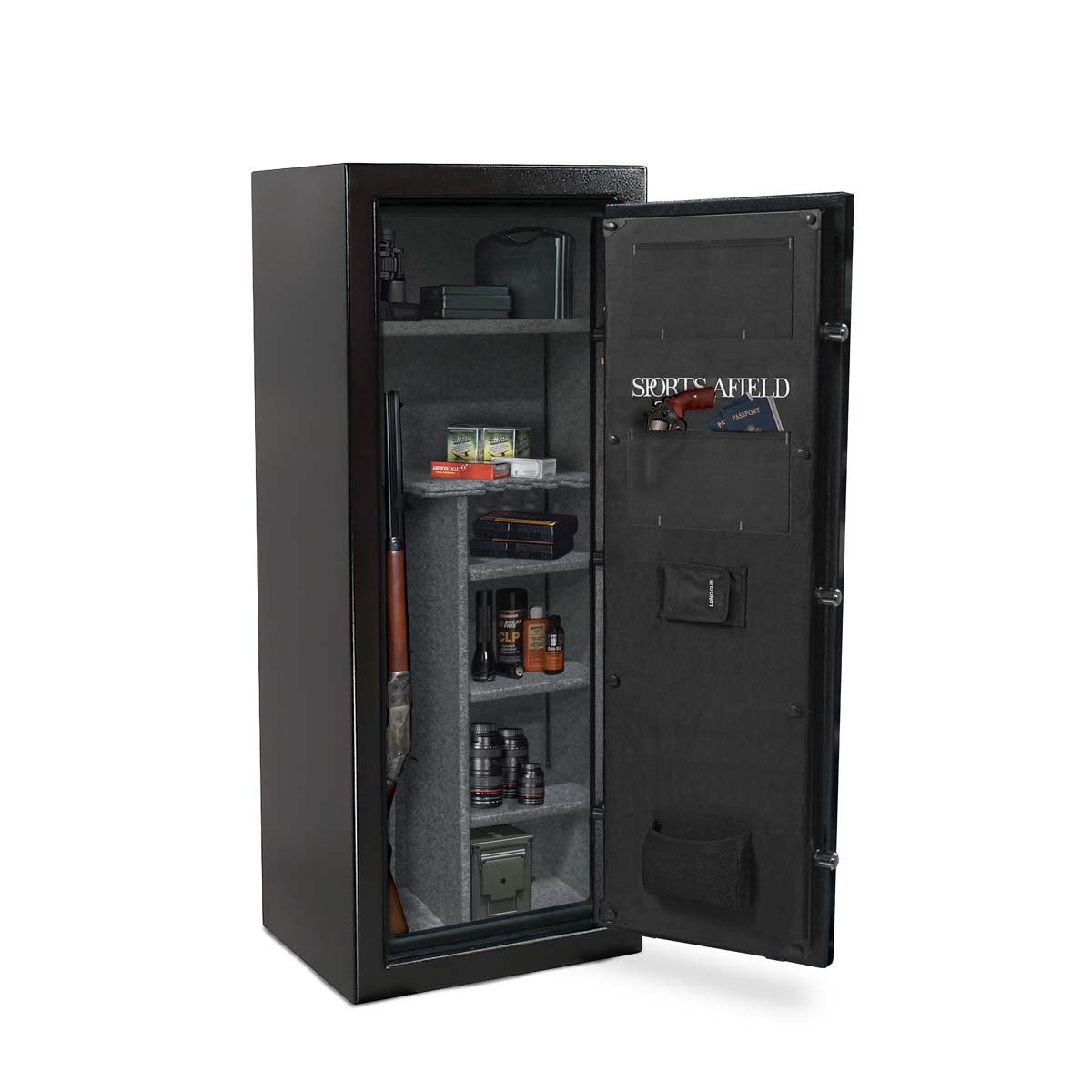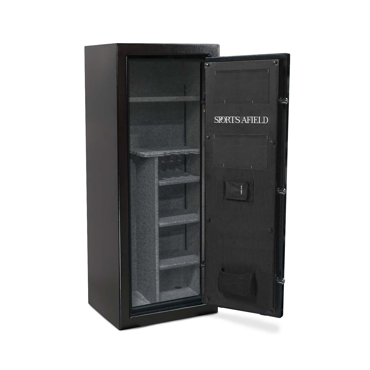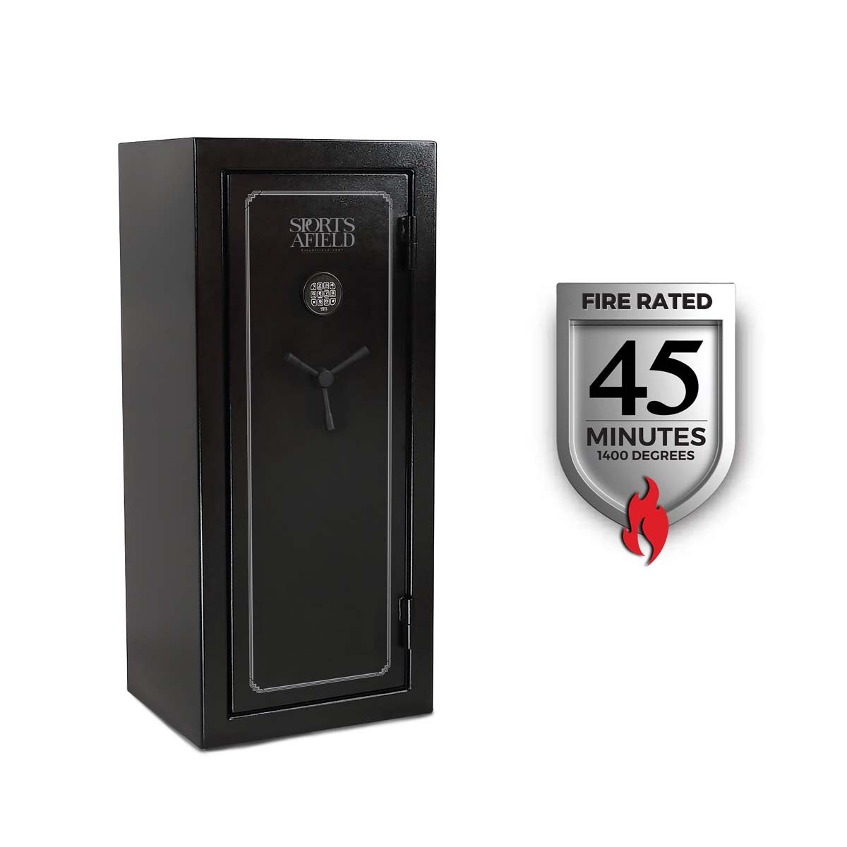 Built to last, designed to protect- the Sports Afield 24 + 4 Fireproof Gun Safe is your ultimate defense against fire and theft. This safe is independently tested and rated to withstand 45 minutesin a fire reaching up to 1400°F. The six 1-inch solid steel bolts and electronic lock have you protected against theft. Inside the safe is fully carpeted to protect your valuables from scratches, and it features height-adjustable/removable side shelves and top shelf so you can configure the interior to suit your storage needs. Our industry's best-in-class Lifetime Warranty covers your
