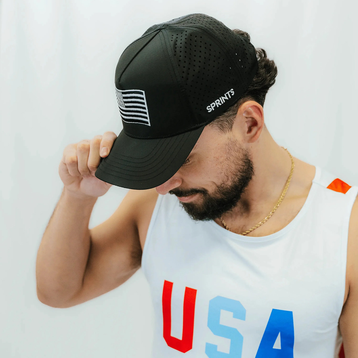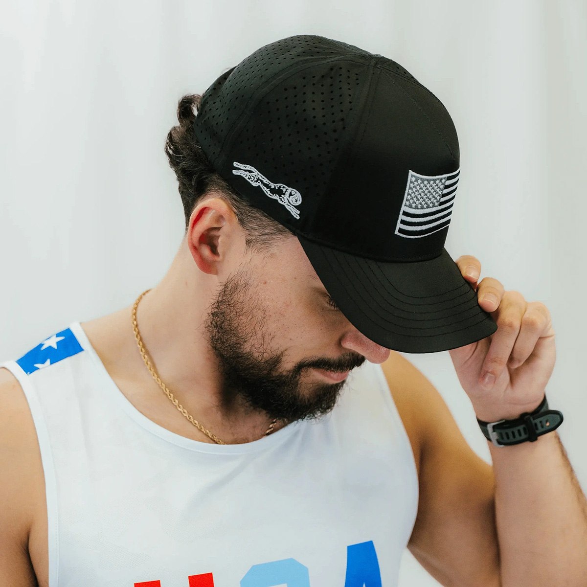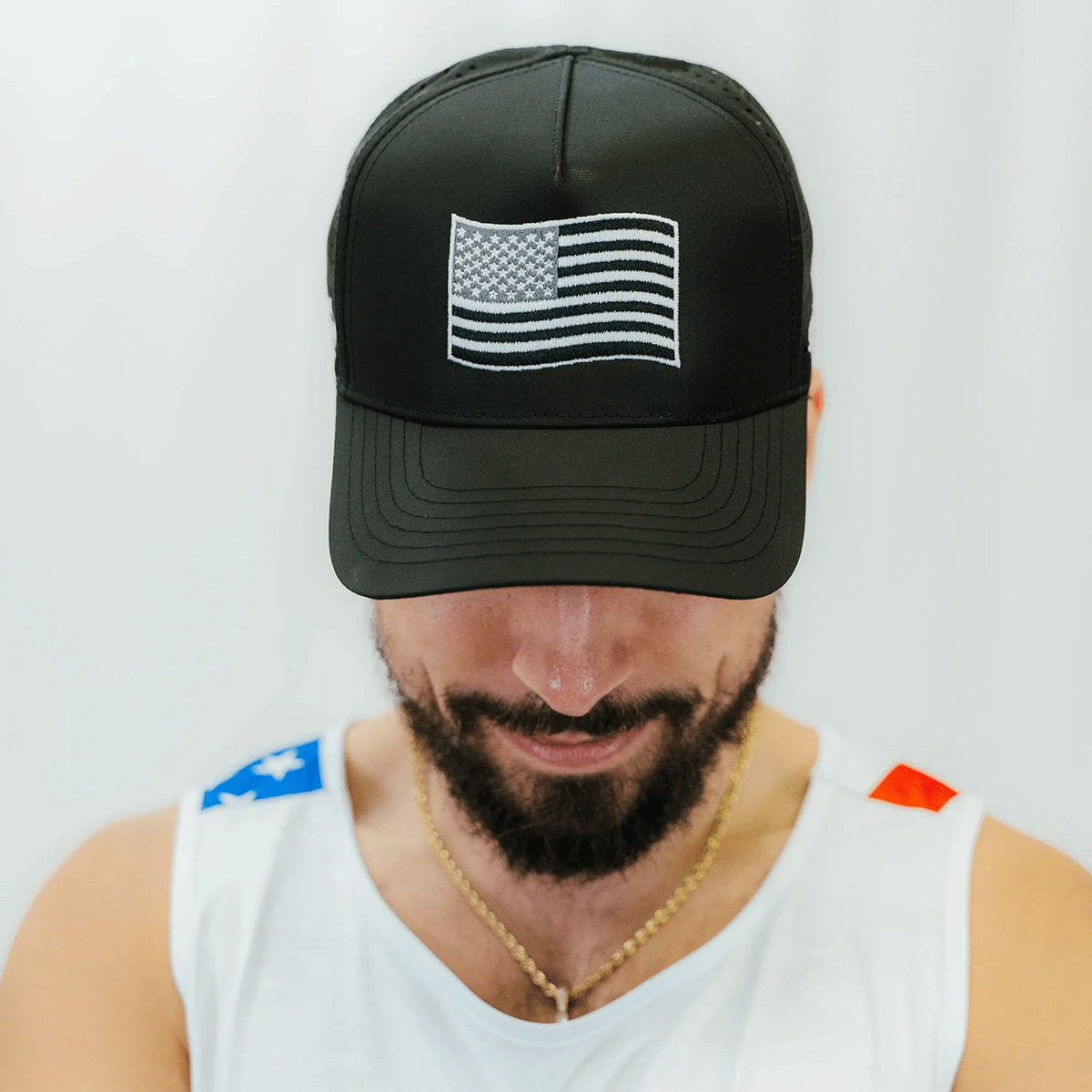 USA Shadow Noir Structured VP Hat brings an understated classic look to your performance kit. This structured, trucker-style running hat is built from lightweight performance fabric and features laser-cut ventilation to keep the air flowing when the miles heat up. A built-in sweatband helps manage moisture, while the snapback closure delivers a dialed-in fit every time. Finished in all black witha grey scale American flag embroidered on the front, it?s a sleek, no-nonsense way to rep the red, white, and blue-shadow style-on every run.