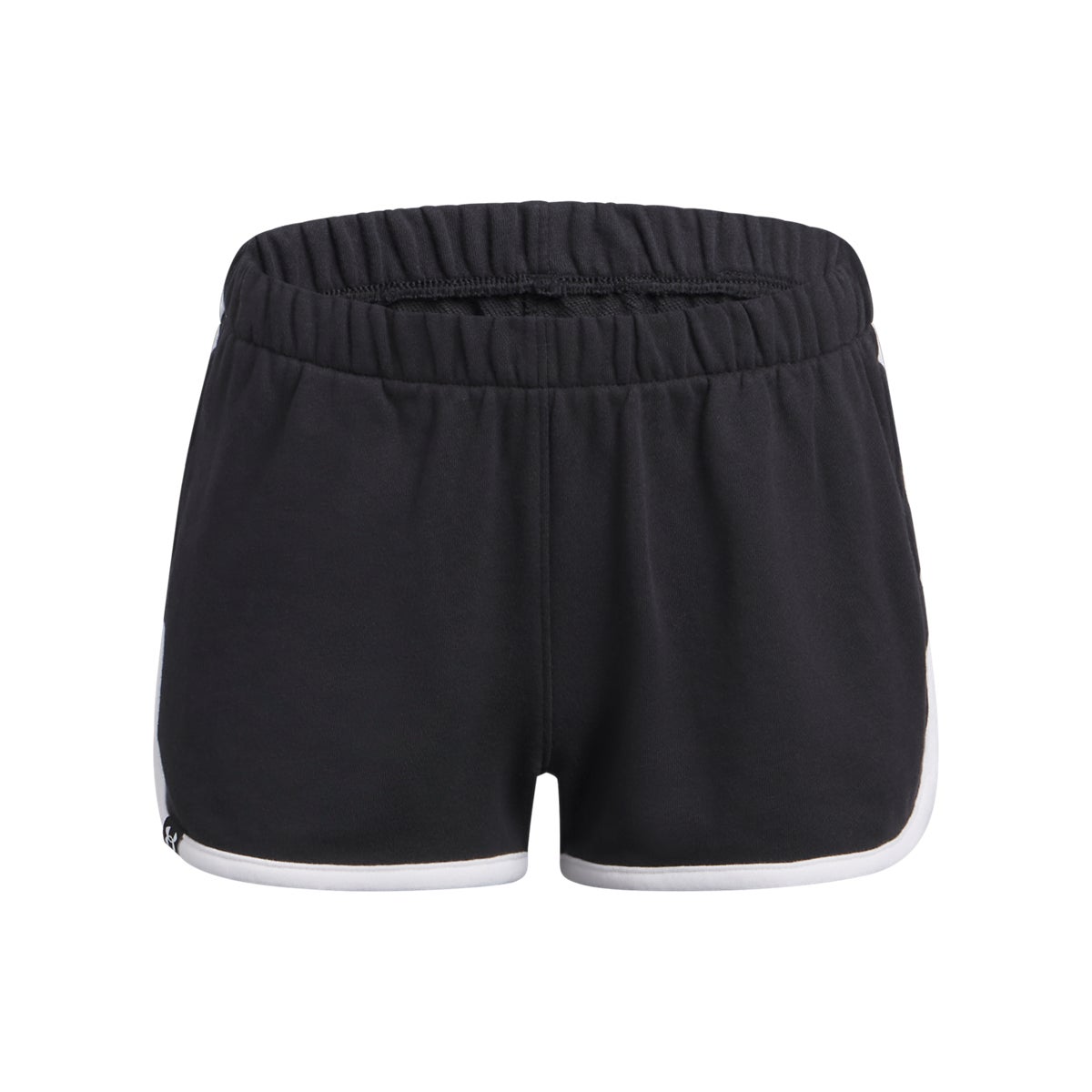 Comfy, warm, and ready for anything, these girls shorts deliver the easy feel of UA s Rival Terry. Lightweight French terry keeps her cozy with a smooth outside and soft interior, while the fitted cut sits secure without bulk. An encased elastic waistband and open hand pockets add everyday convenience. Finished with a shaped hem and contrast binding for sporty style.
