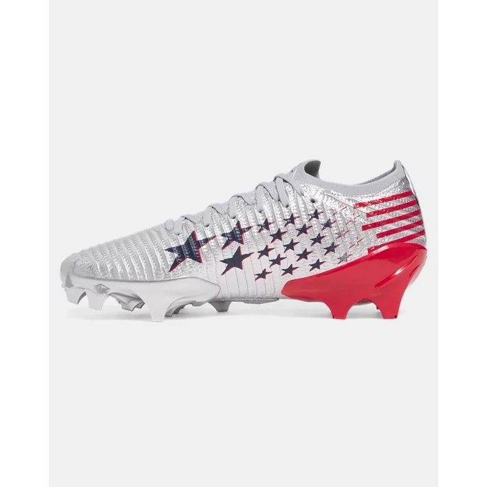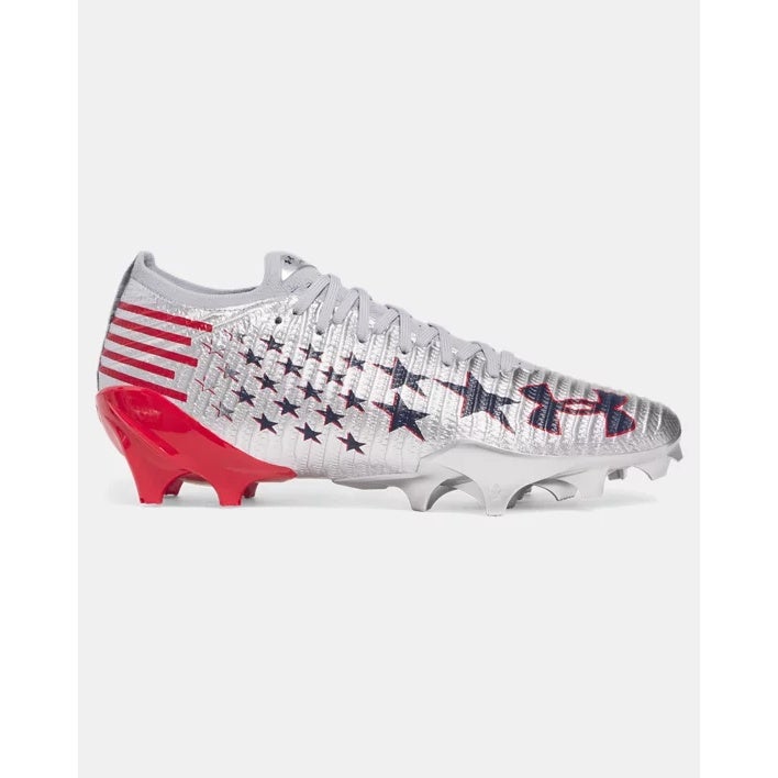 Built for game-breaking speed, these men's football cleats pair a breathable UA IntelliKnit upper with lightweight protection for a locked-in feel. A HOVR drop-in midsole returns energy to keep your feet fresh through four quarters, while a biomechanical plate delivers sharp cuts and acceleration. The USA-inspired limited edition design stands out with metallic silver, navy star graphics, and redheel accents.