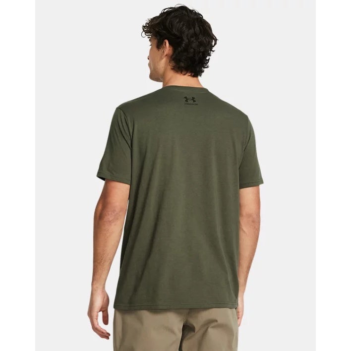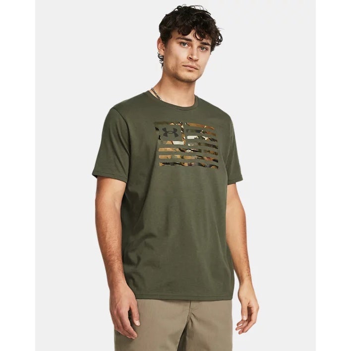 Show your support in a soft, everyday tee made for comfort. This men's UA Freedom T-shirt features a camo-flag front graphic on an olive green base with a classic crewneck cut. Built from a breathablecotton-blend knit in a loose fit, it s easy to wear from workouts to weekends. Finished with a subtle UA Freedom hit at the back neck.
