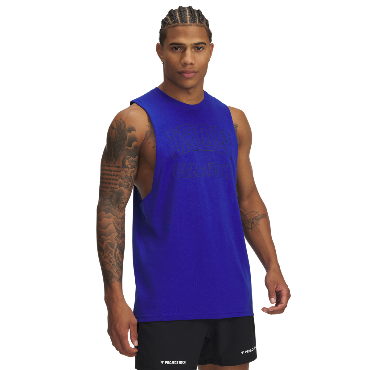 Project Rock training gear was built for the hardest workers in the room. This tank pays homage to Dwayne Johnson's gym, the Iron Paradise with a graphic that only shows up when you sweat.