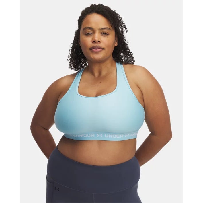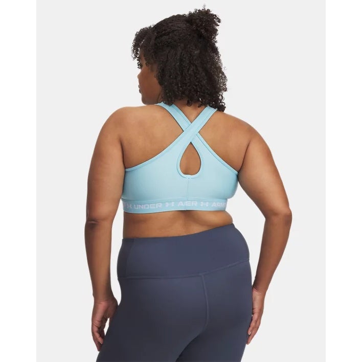 Built for medium-impact training, this streamlined sports bra delivers the support you need without bulk. Smooth double-layer HeatGear fabric feels cool against the skin while moisture-wicking performance keeps you dry. Soft, quick-drying cups add breathable coverage, and crossover straps with a keyhole back make on/off easy. Finished with a smooth elastic band for a secure, comfortable fit.