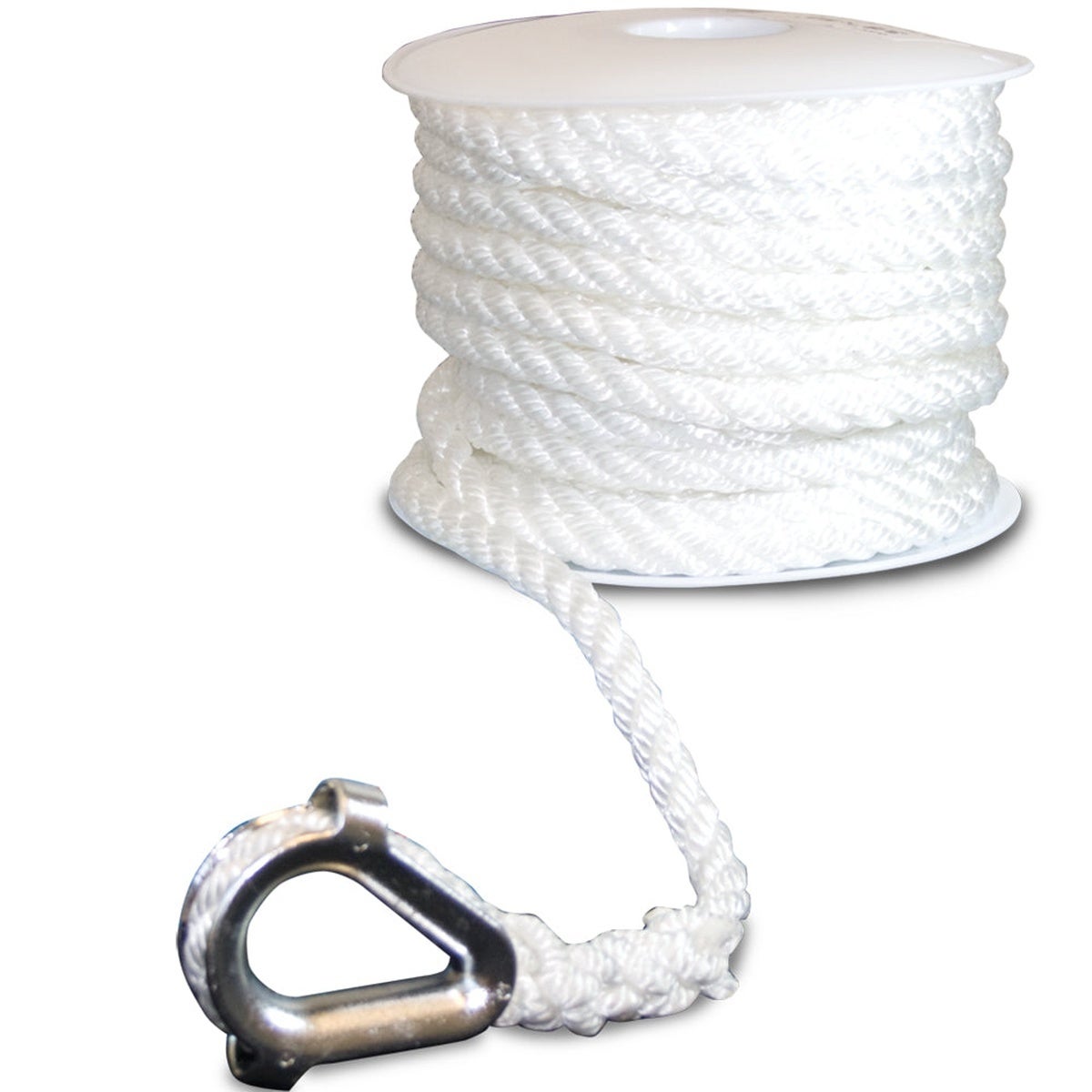 Built for dependable anchoring and mooring, this three-strand twisted nylon anchor line is designed to absorb shock loads created by boat motion. The premium nylon fibers are made to resist shrinkingor stiffening when exposed to moisture. A factory eye splice with a non-corrosive, chrome-plated nylon thimble helps protect the line at the connection point.