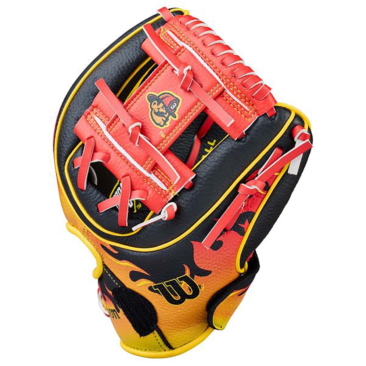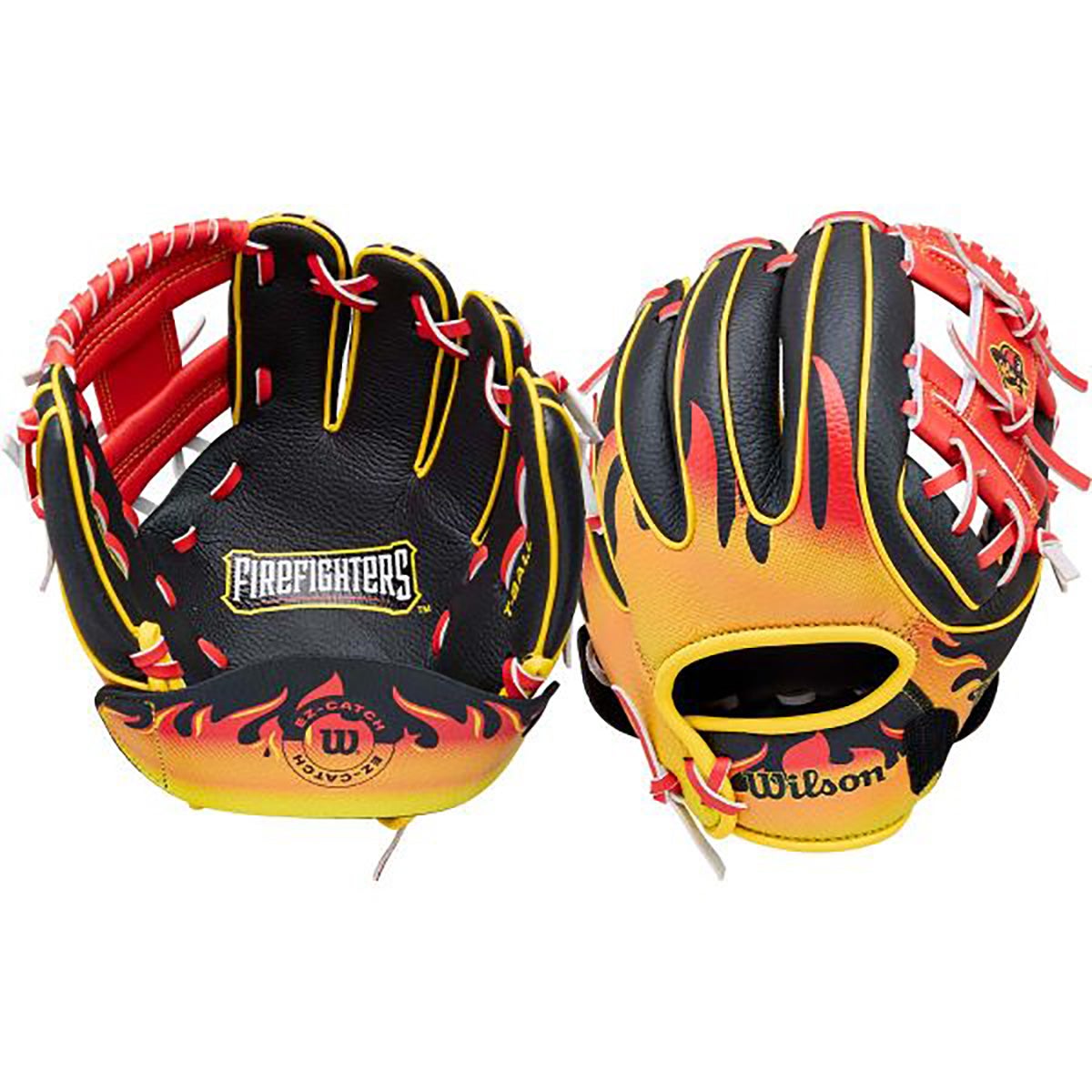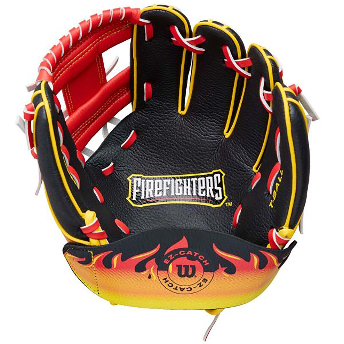 dynamic black and red firefighter flame design with an H-web to assist in ball visibility and a smaller hand opening for a snug fit on smaller hands. Plus, rolled dual welting is integrated into