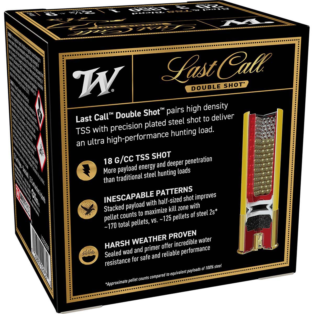 Built for late-season waterfowl, these 20-gauge Last Call Double Shot shells blend precision-plated steel with dense TSS shot for lethal patterns and deep penetration. A sealed wad and primer help shrug off harsh, wet conditions. Engineered to maximize pellet counts in the kill zone, this 3-inch load delivers fast velocity in a custom mixed payload.