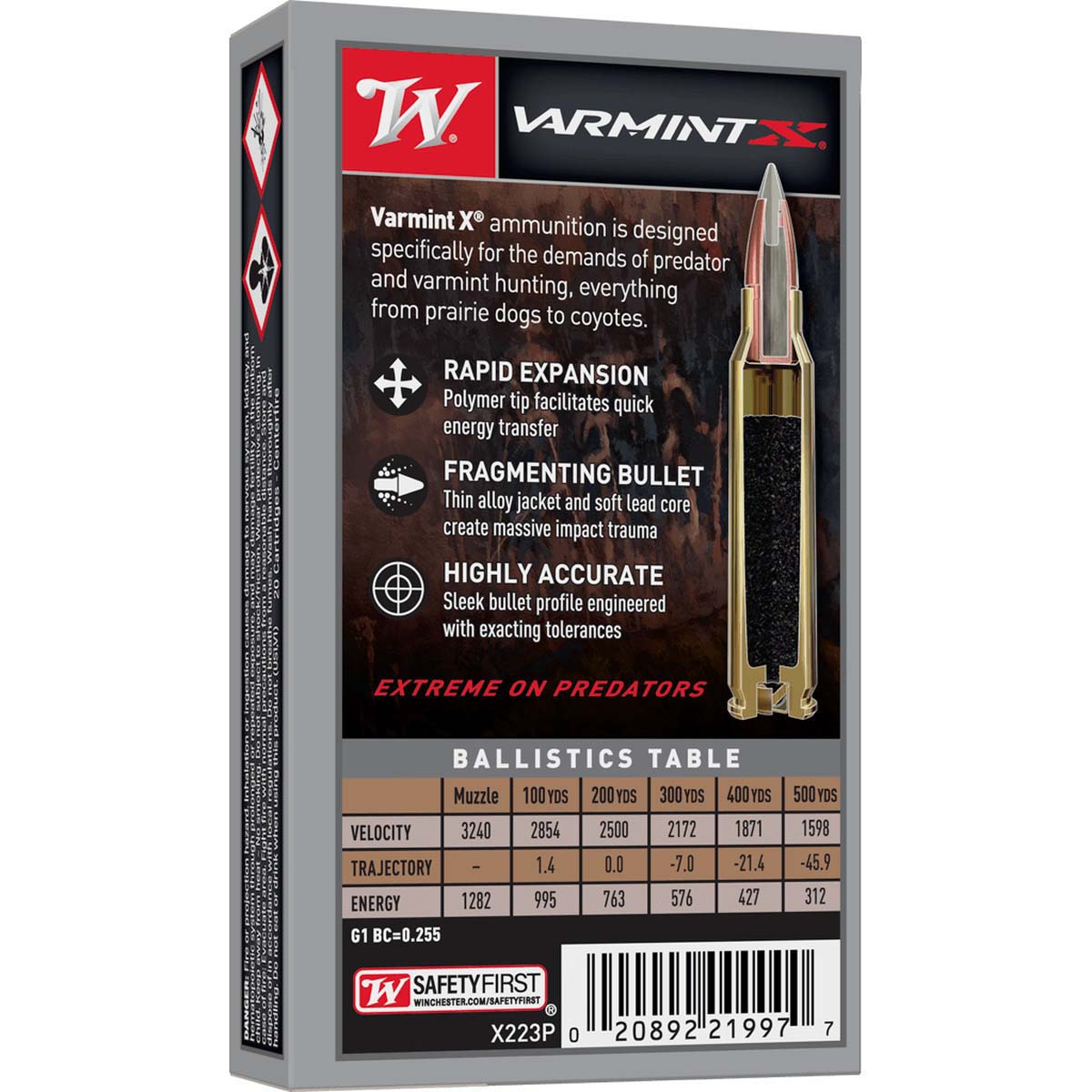 Engineered for predator and varmint hunting, this 223 Remington load pairs a 55-grain, polymer-tipped bullet with Winchester s proven performance. The sleek projectile delivers rapid energy transfer and confident accuracy at distance. Ideal for pursuits from prairie dogs to coyotes, it offers reliable, explosive impact when it counts.