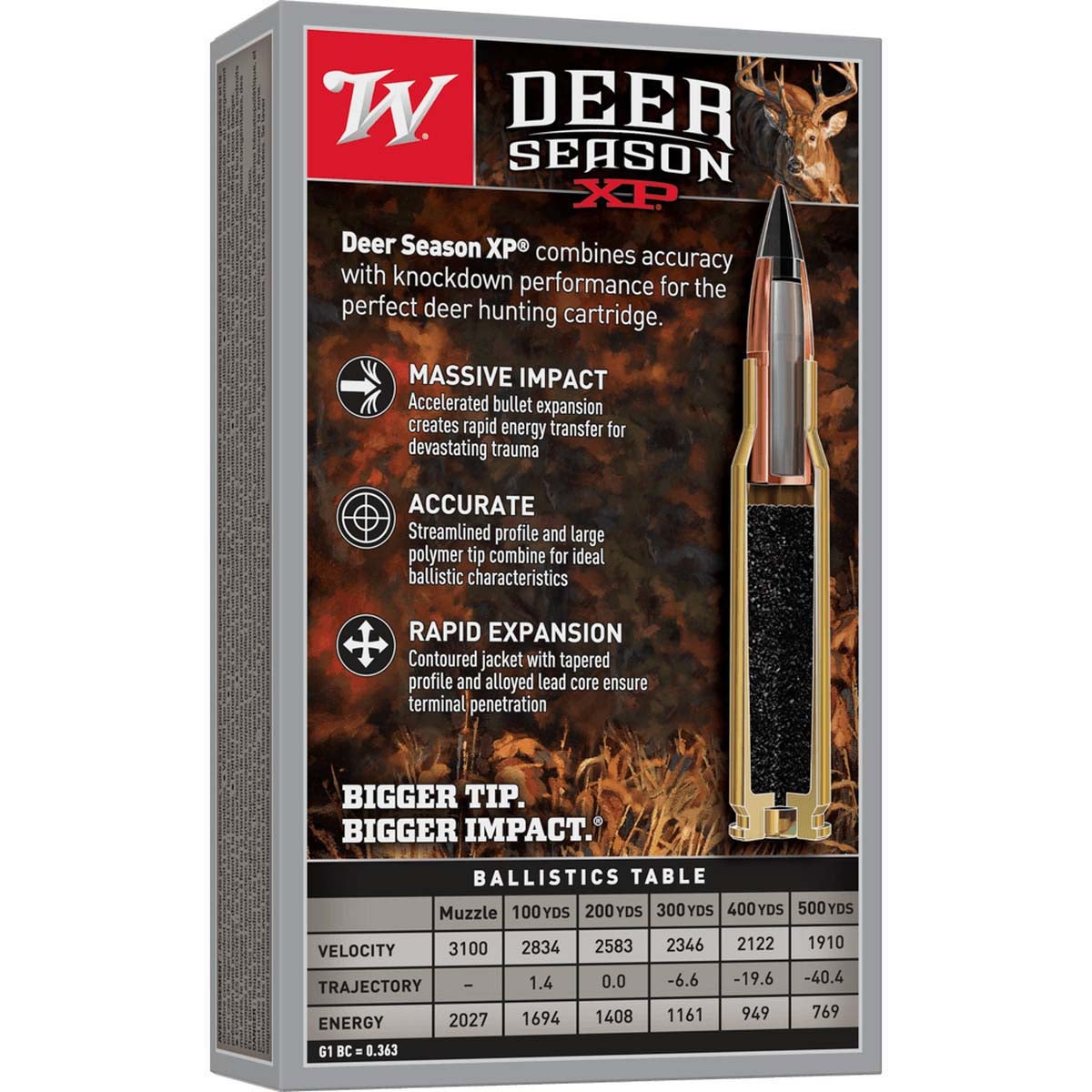 Purpose-built for deer hunting, this 243 Winchester load delivers fast knockdown with Winchester s Deer Season XP design. The Extreme Point bullet features a large polymer tip and streamlined profilefor efficient flight and energy transfer. Engineered for rapid expansion and deep terminal performance, it s made to maximize impact when it counts.