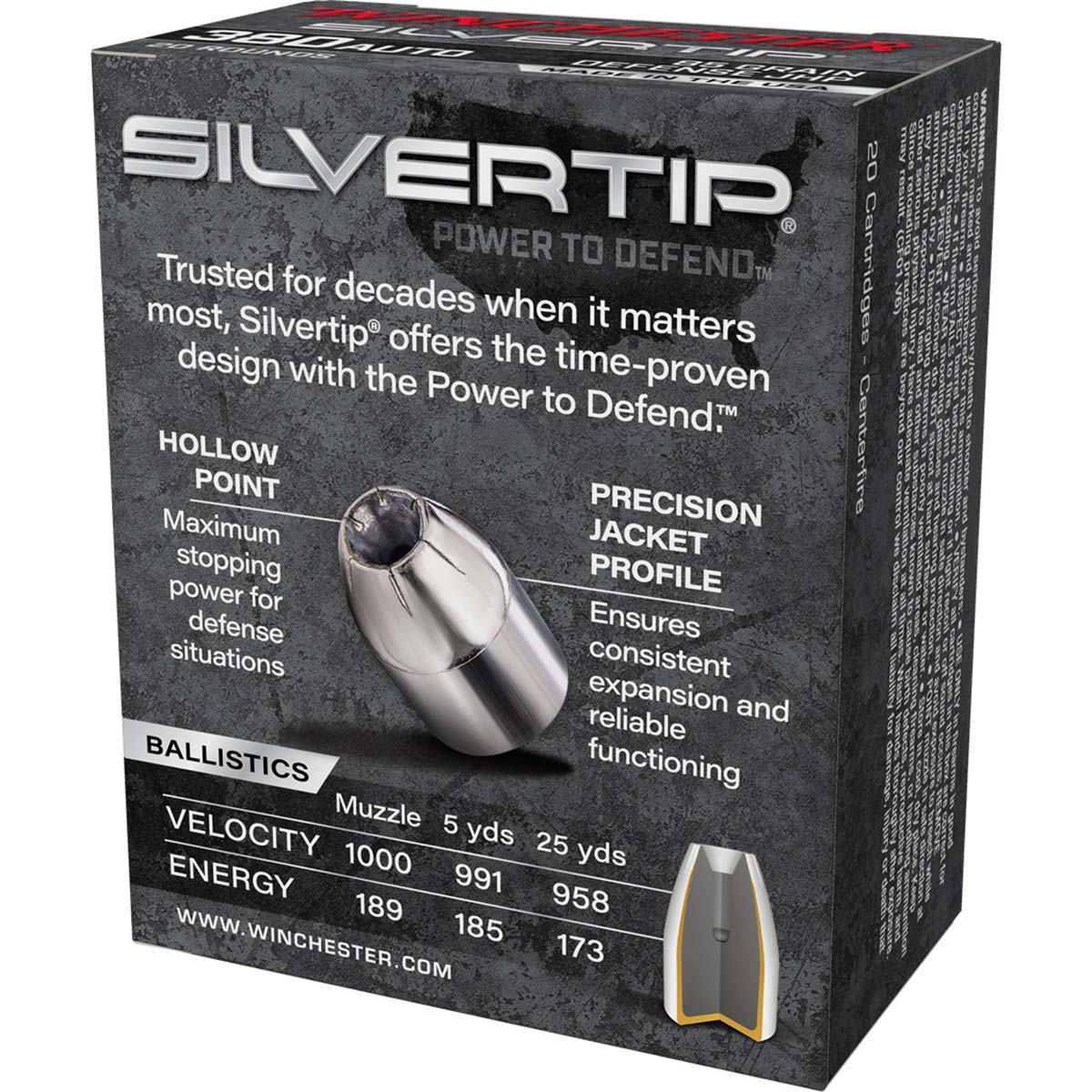 Built for personal defense, this 380 Auto load pairs Winchester s time-proven Silvertip design with an 85-grain jacketed hollow point for reliable expansion. From muzzle to distance, it delivers consistent velocity and energy for confident performance. Ideal for concealed-carry pistols, each box contains 20 cartridges made in the USA.
