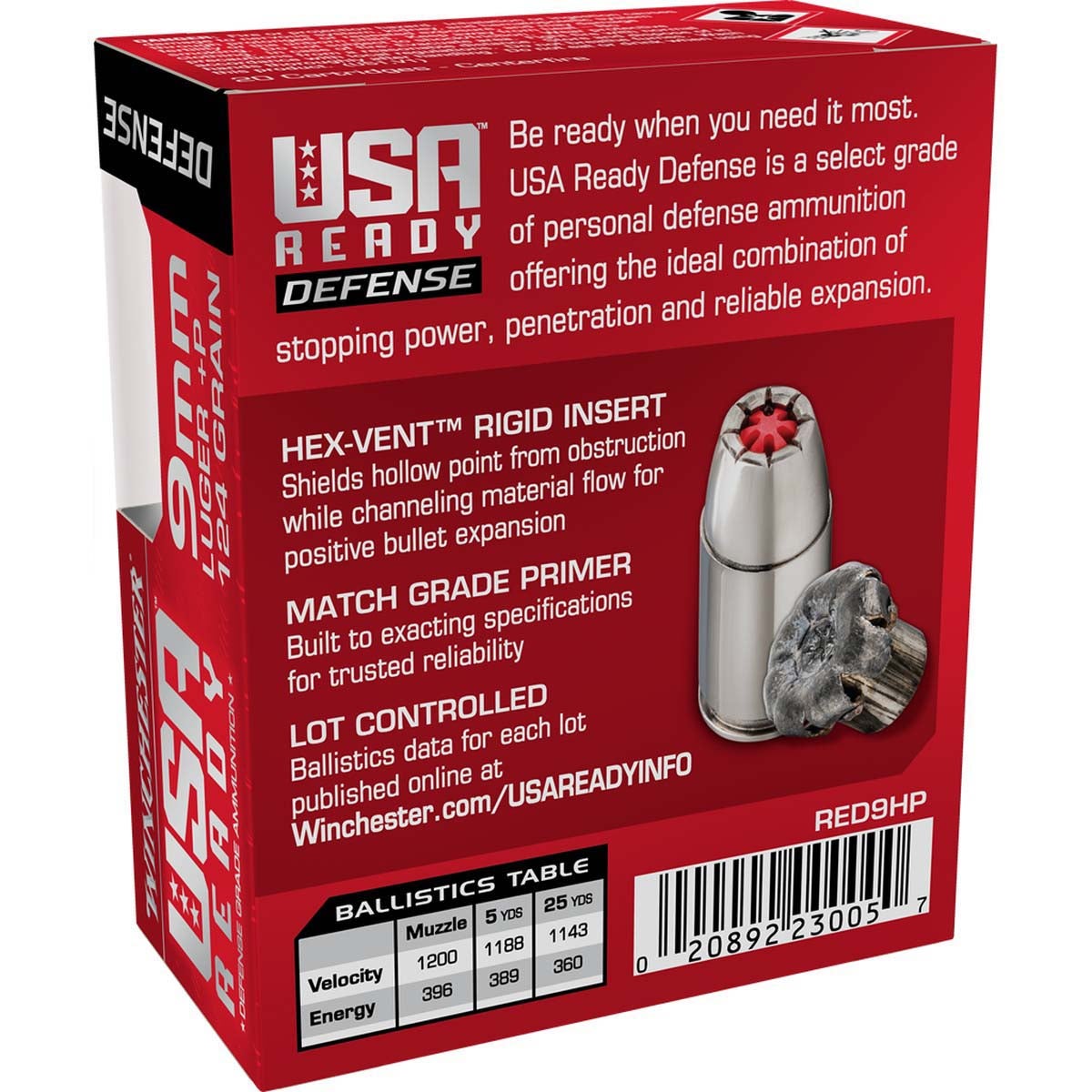 Built for personal protection, this 9mm Luger +P load pairs a 124-grain jacketed hollow point with Winchester s USA Ready Defense design. It s engineered to deliver a balance of stopping power, controlled penetration, and dependable expansion. Purpose-driven components and quality controls help ensure performance you can trust when it matters most.