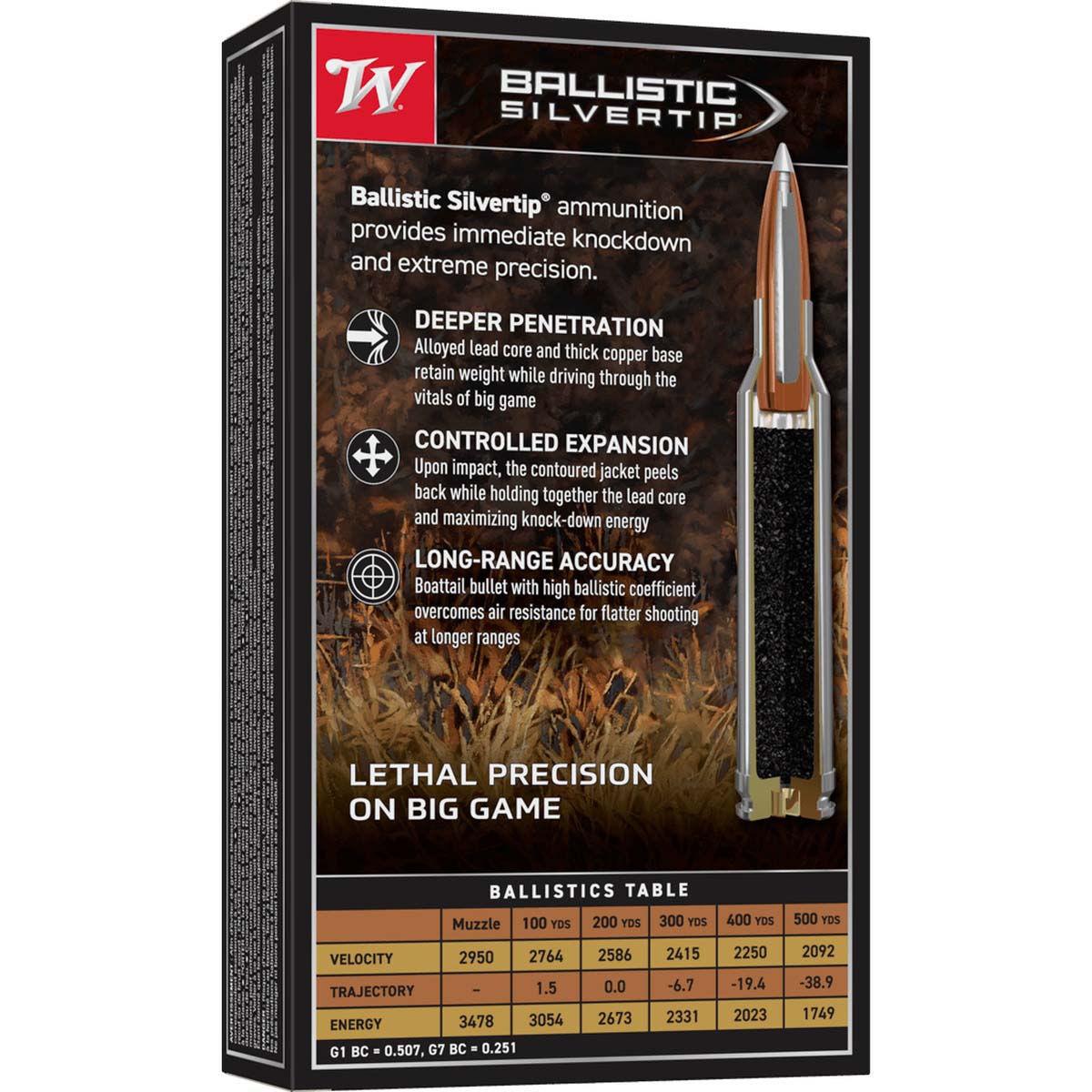 Engineered for big game performance, this Ballistic Silvertip load delivers swift knockdown and precise accuracy. The 300 Win Mag cartridge is paired with a 180-grain boattail bullet designed for consistent flight and controlled expansion on impact. Built with a contoured jacket and alloyed lead core, it retains weight while driving deep into vital areas. Ideal for hunters seeking confidence at extended ranges.
