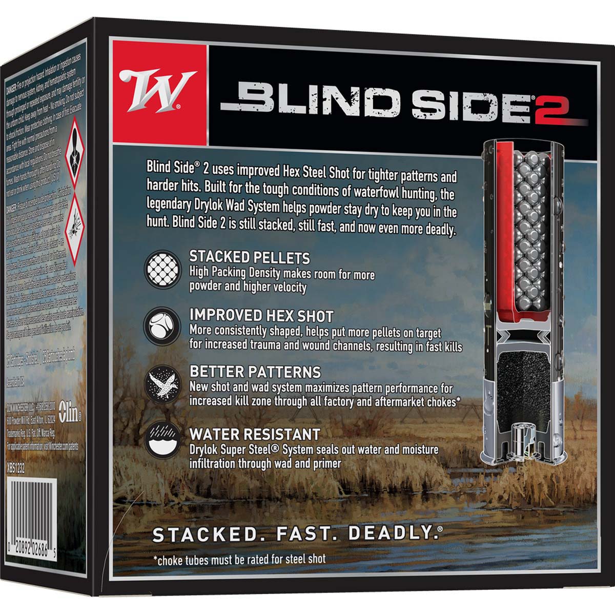 Built for harsh waterfowl conditions, these shotshells feature Winchester s Drylok wad system to keep powder dry and performance consistent. The Blind Side 2 design uses improved Hex Steel Shot for tighter patterns and harder hits. Stacked pellet packing increases room for powder and velocity, helping deliver fast, lethal results on ducks and geese.