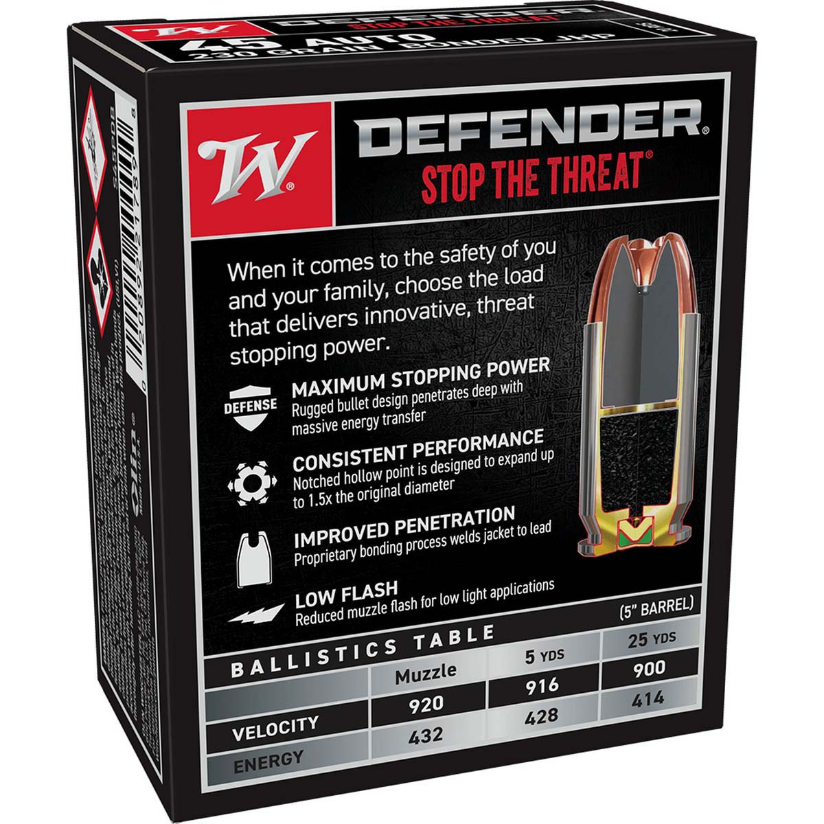 Engineered for personal defense, this .45 Auto load from Winchester s Defender line delivers reliable threat-stopping performance. Its bonded jacketed hollow point is designed for deep penetration andcontrolled expansion from defensive handguns. Clean, consistent power and reduced muzzle flash support confident shooting in low-light situations. Packaged in a 20-round box.